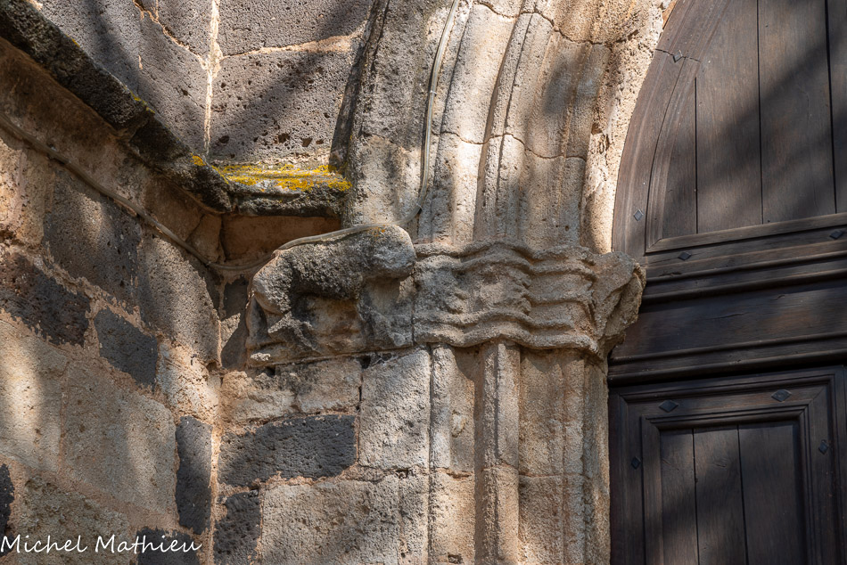Le portail ogival possède un élégant encadrement mouluré réalisé non en basalte, qui n’est adapté à la taille, mais dans un calcaire blanc très fin. Il est flanqué de piédroits dont l'imposte est sculptée de chaque côté de la porte d'une tête humaine, de chapiteaux feuillagés et d'un animal fantastique, tous très érodés.