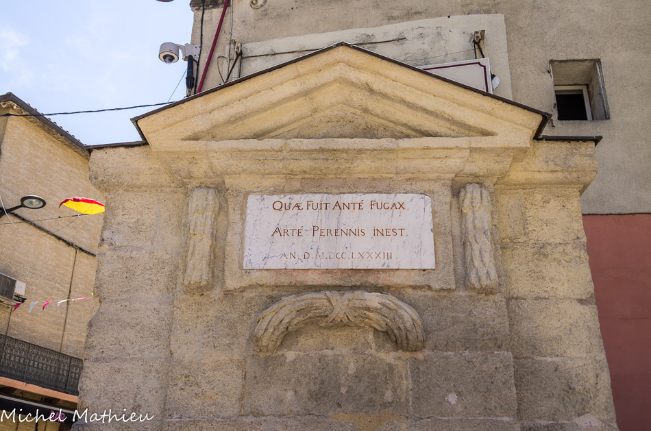La plaque de marbre qui orne la fontaine porte l’inscription latine suivante :