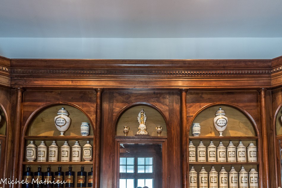 L’apothicairerie de l’Hôpital de Lodève. Les pots sont en porcelaine qui a remplacée la faïence, car elle est plus dure grâce à l'emploi du kaolin. Les gros pots sont appelés des monstres, car c'est dans ces pots que l'on montrait les préparations.