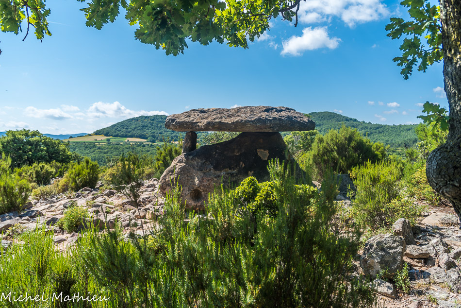 Dolmen de Coste-Rouge. Les pierres ont été transportées sur des rondins, probablement, depuis un lieu-dit voisin : Pierre-rouge. Il a été érigé suivant une technique combinant plans inclinés en terre battue et rouleaux de bois.