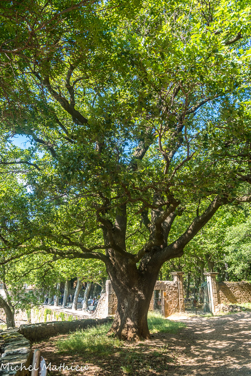 Chêne blanc. Il est agé d'environ 400 ans. A droite, le portail donnant sur l'esplanade avec des platanes.
