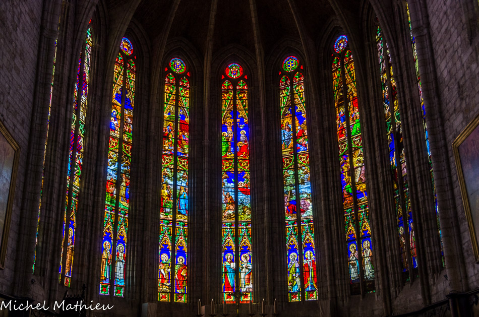 L'archiprêtre Beaupillier, au XIXe siècle, s'attache à embellir l'intérieur de la cathédrale: il est à l'origine de la réouverture des baies du chœur (occultées depuis le XVIe siècle) et de la mise en place des superbes vitraux de Mauvemay. Les vitraux, de 12 m de haut, datés de 1854, représentent : au bas, une série de saints ; au centtre, des scènes de l'Ancien Testament ; en haut, les scènes du Nouveau Testament qui leur correspondent.