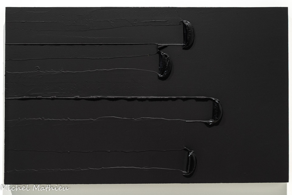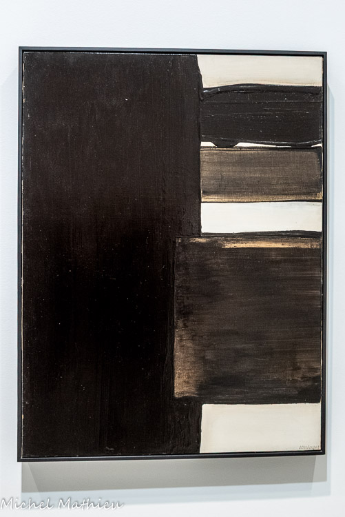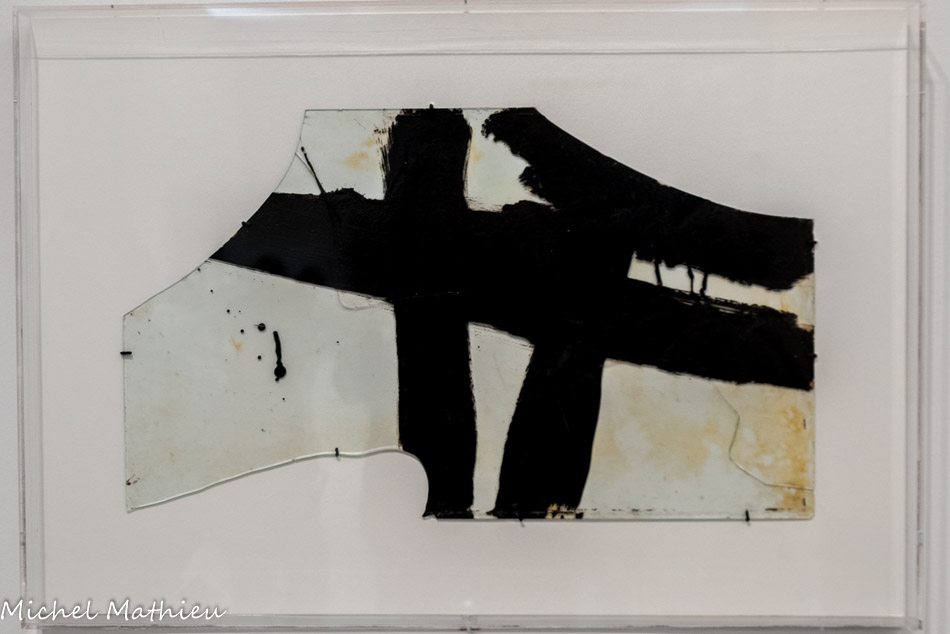 Paris, Centre Pompidou, Musée national d’art moderne / Centre de création industrielle. Don de l’artiste en signe d’amitié et d'estime pour Alfred Pacquement, 2013. En séjour à Montpellier durant l’été 1948, Soulages réalise quatre peintures au noir de goudron qu’il étale sur des plaques de verre brisé, à l’aide d’une « queue-de-morue » de peintre en bâtiment. Le peintre en parle comme des réminiscences d’un souvenir, lors de son arrivée à Paris en 1946, ému qu’il était devant les verrières de la gare de Lyon, endommagées pendant la guerre et rapiécées avec du goudron. Dans ces œuvres, dont trois ont été conservées, la matière épaisse, fréquemment employée pour imperméabiliser les toitures, est diluée au white spirit. Par la densité de la matière, ces œuvres préfigurent les toiles monopigmentaires de la finde sa carrière et par le support, les vitraux de l’église abbatiale Sainte-Foy de Conques.
