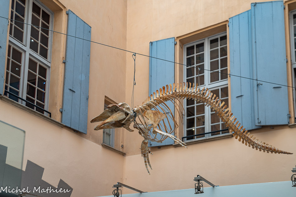 Grampus griseus (Cuvier, 1812). Dauphin de Risso. Squelette d'un animal de 3,20 m de long, trouvé mort le 5 novembre 1982 à Le Barcarès. Espèce teuthophage (qui se nourrit principalement de calmars et de seiches), il fréquente, en groupe, le bord du talus continental. Il se caractérise par la présence de nombreuses cicatrices blanchâtres sur le corps qui augmentent avec l’âge. Adulte, le mâle peut atteindre les 4 m de long pour un poids supérieur à 600 kg. Il possède de 3 à 7 paires de dents sur la mâchoire inférieure et aucune sur la supérieure. Sa nageoire dorsale, est la plus longue de tous les cétacés (proportionnellement à la longueur du corps).