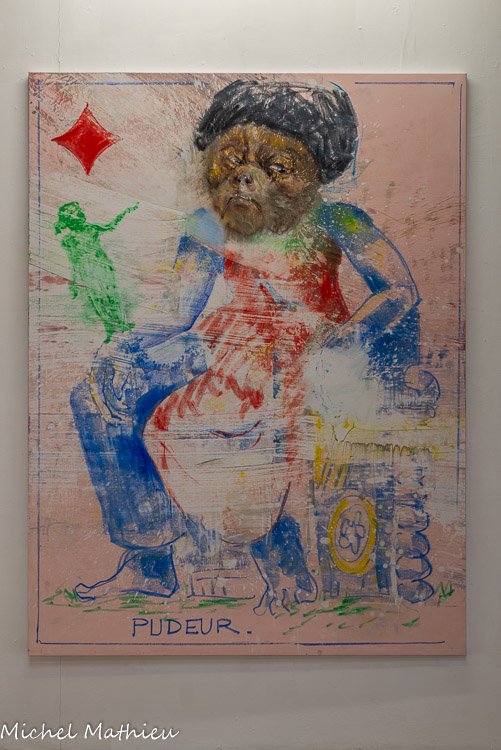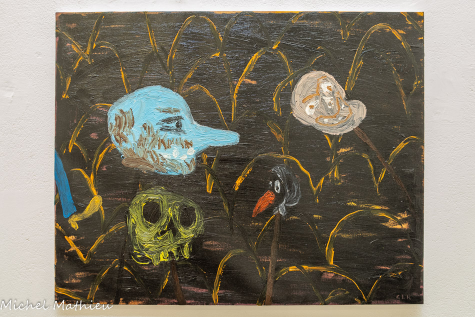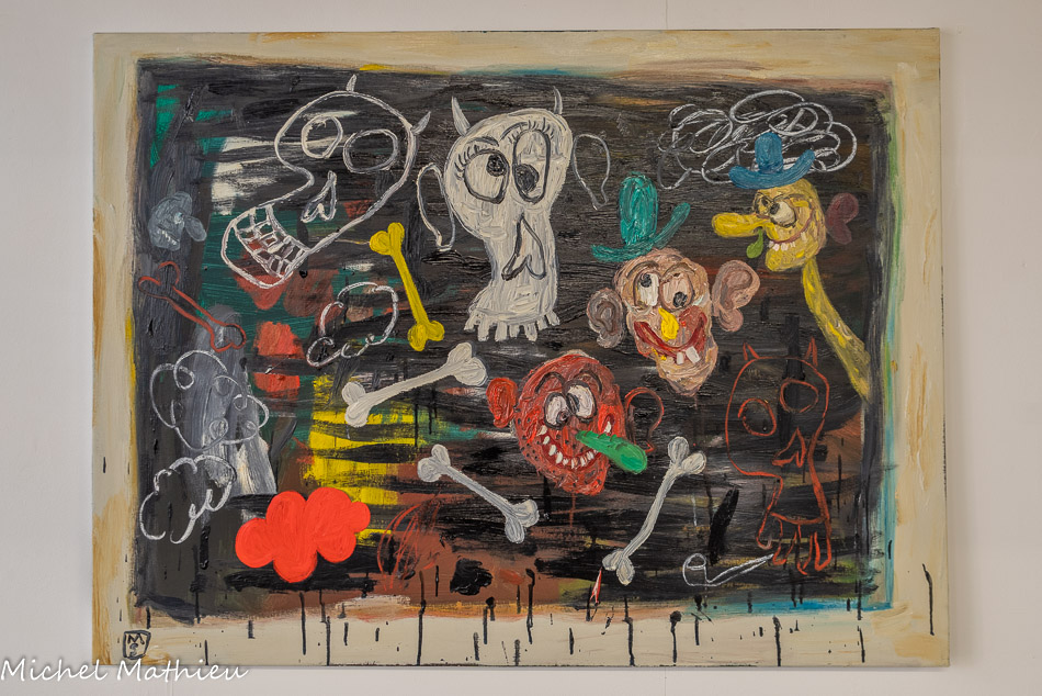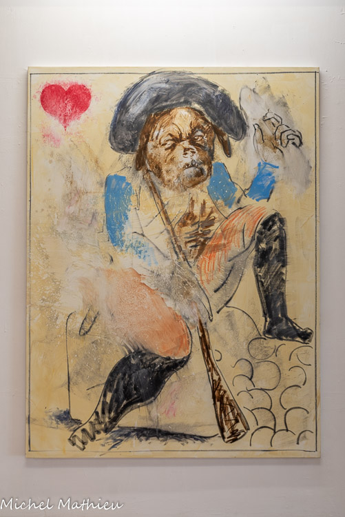 Cristina Lama et Marias Sanchez, deux peintres vivant à Séville partagent l’exposition. Ils convoquent comme lui des figures, des masques et des clowns avec une forme d’ambivalence. Du carnaval, comme dans la culture espagnole populaire, jusqu’aux cartoons américains. Les crânes sont très fréquents: sont-ils la mort, comme vu en occident, ou la vie qui revient comme dans la culture latine mexicaine? La figure de Mickey peut elle aussi être drôle ou mélancolique. La naïveté est poussée jusqu’au bout.