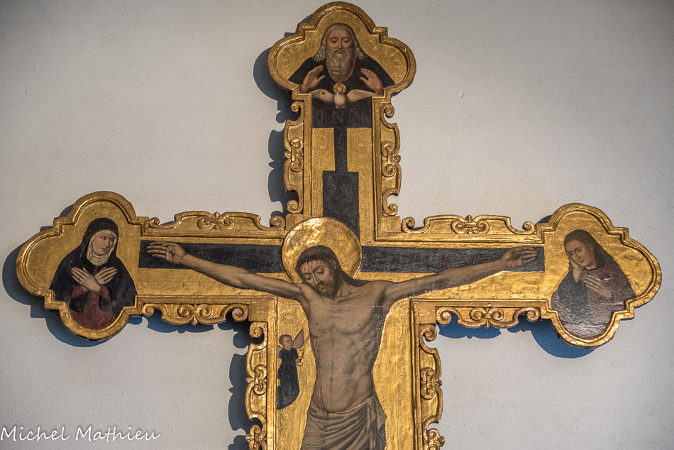 Église Santa Maria di Castello. Antoine Bréa, crucufix. Les Christe médiévaux sont représentés morts sur la croix. Les bourgeons au bout des bras représentent la vie éternelle.