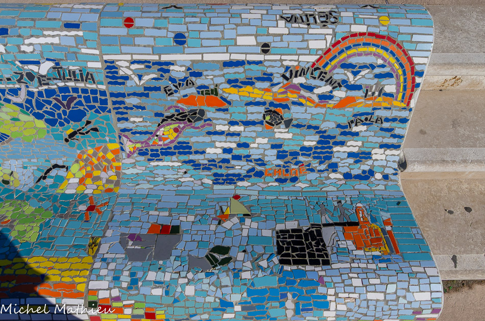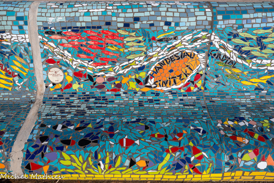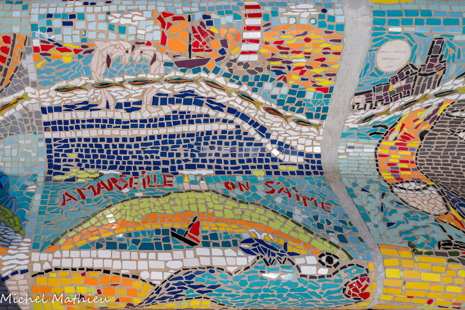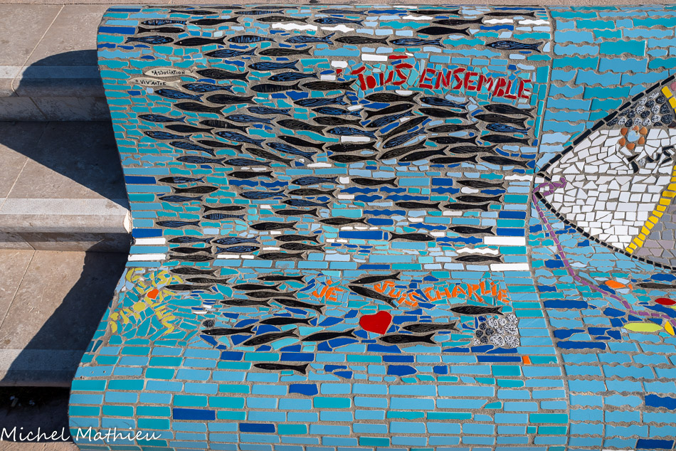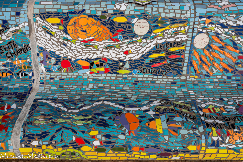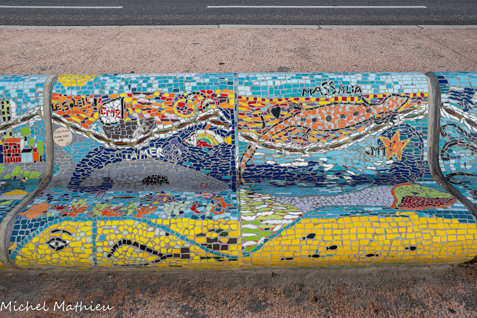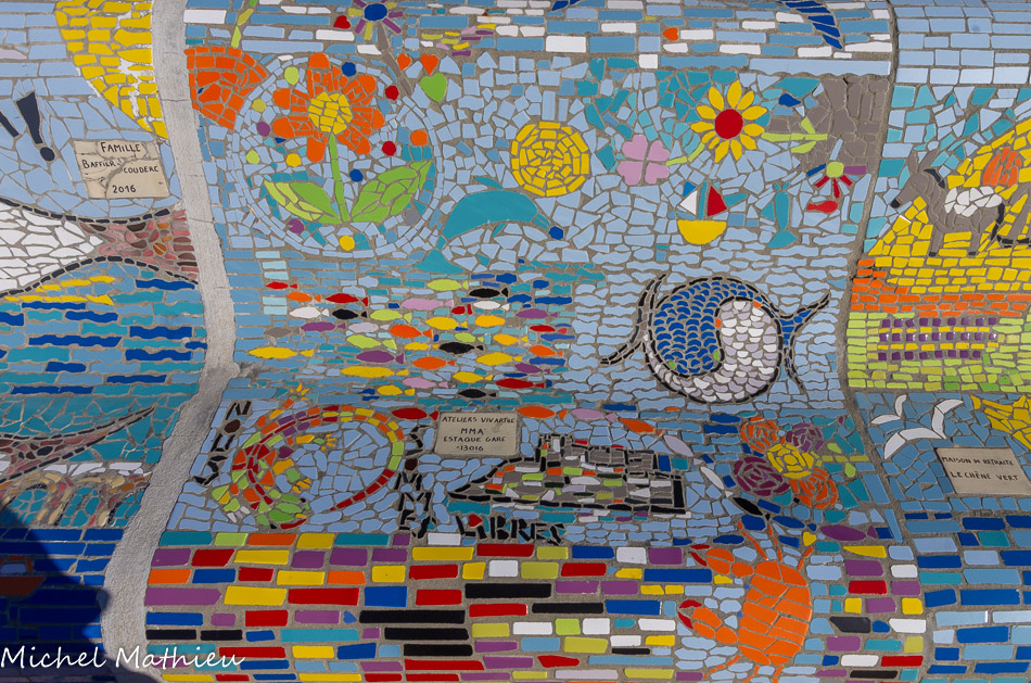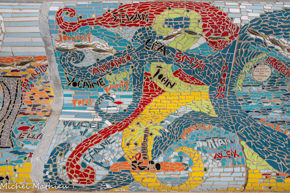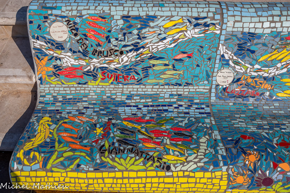 Bancs Ulule, Ecole Pharo-Catalans, 13007, 2019. Les petits poisons portent les noms de élèves.