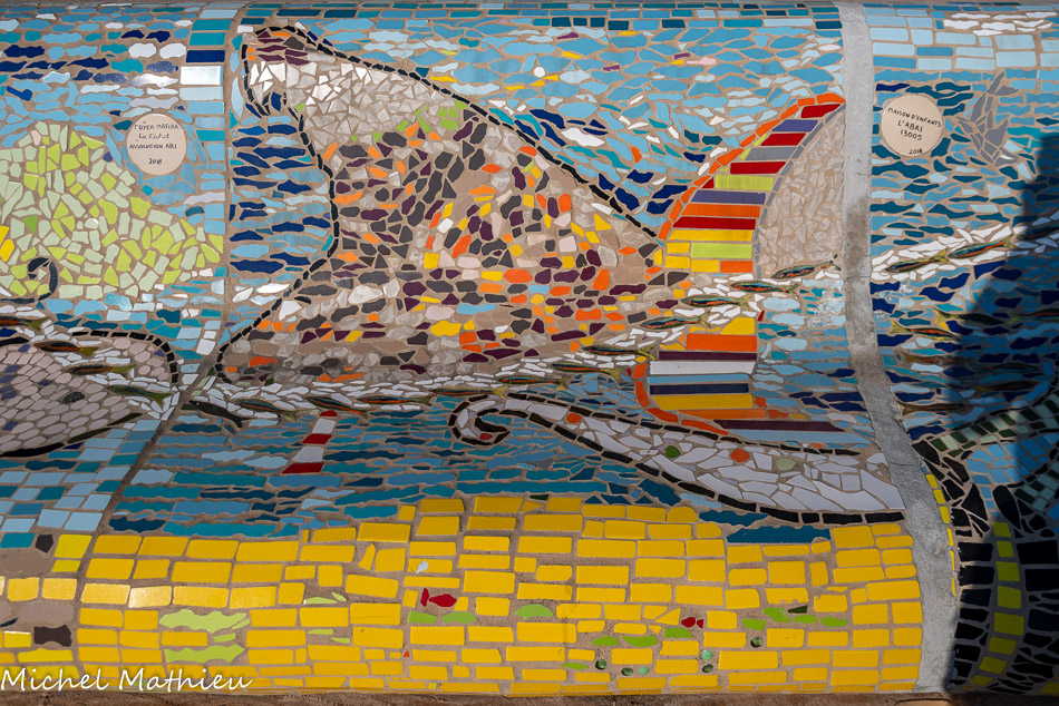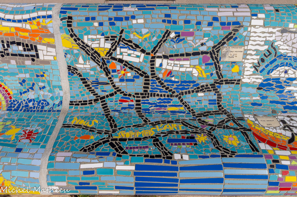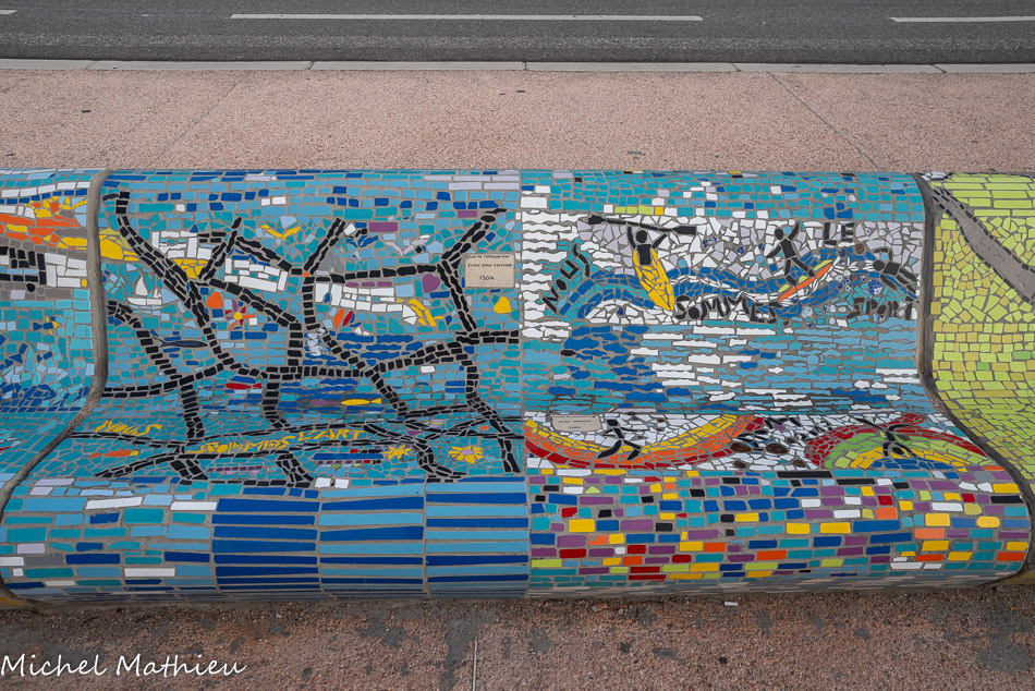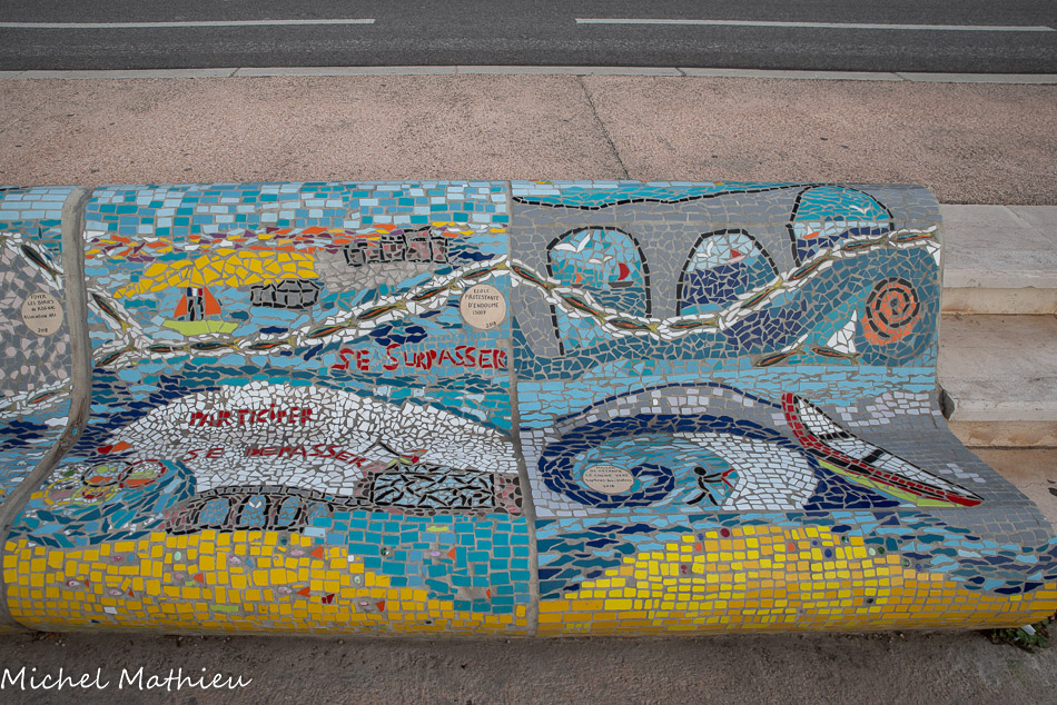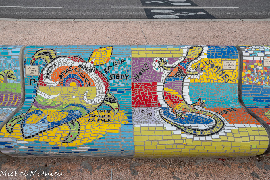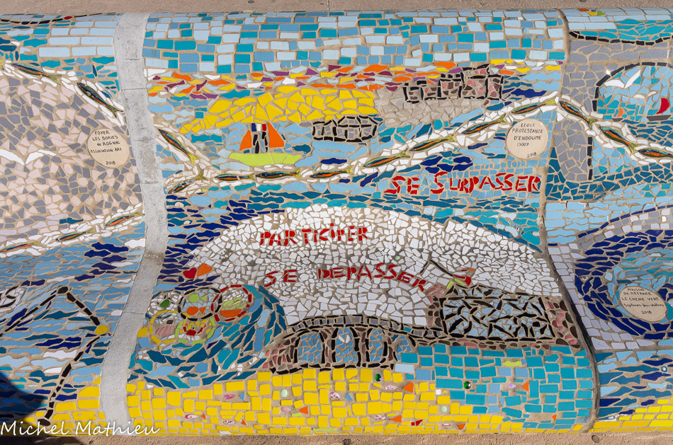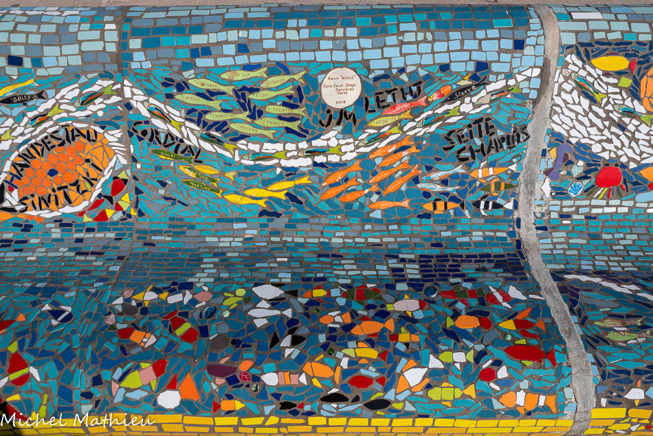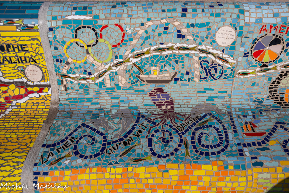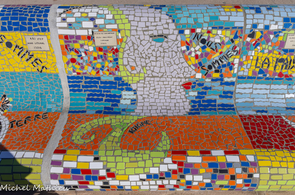 Bancs Ulule, Ecole Pharo-Catalans, 13007, 2019. Les petits poisons portent les noms de élèves.
