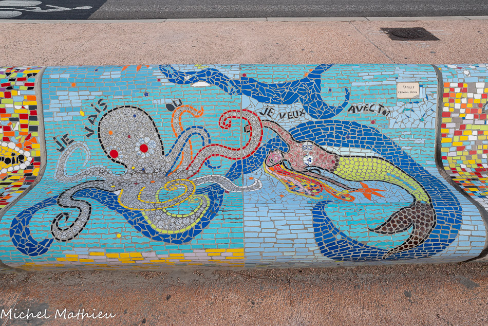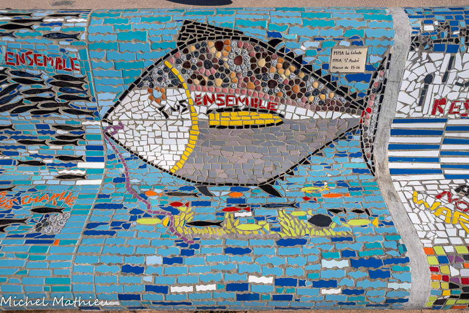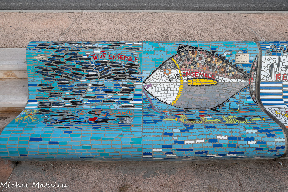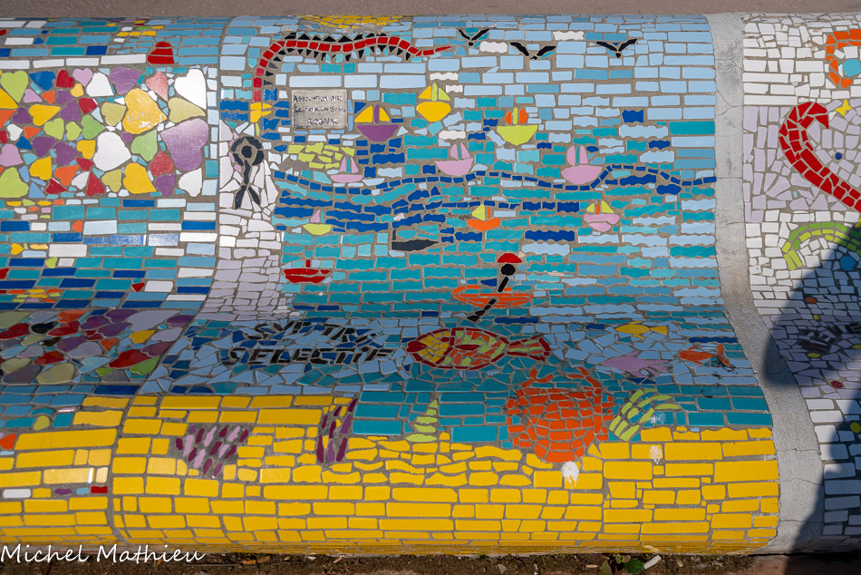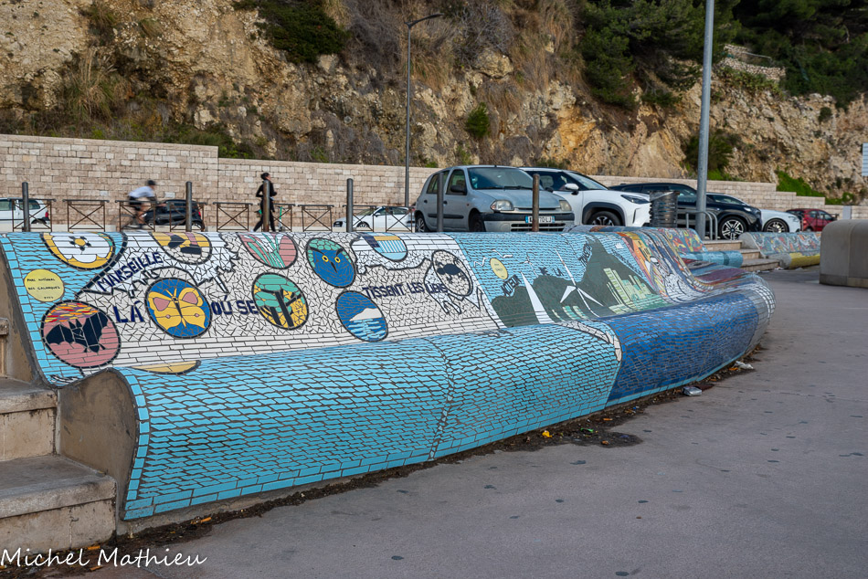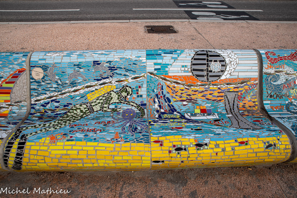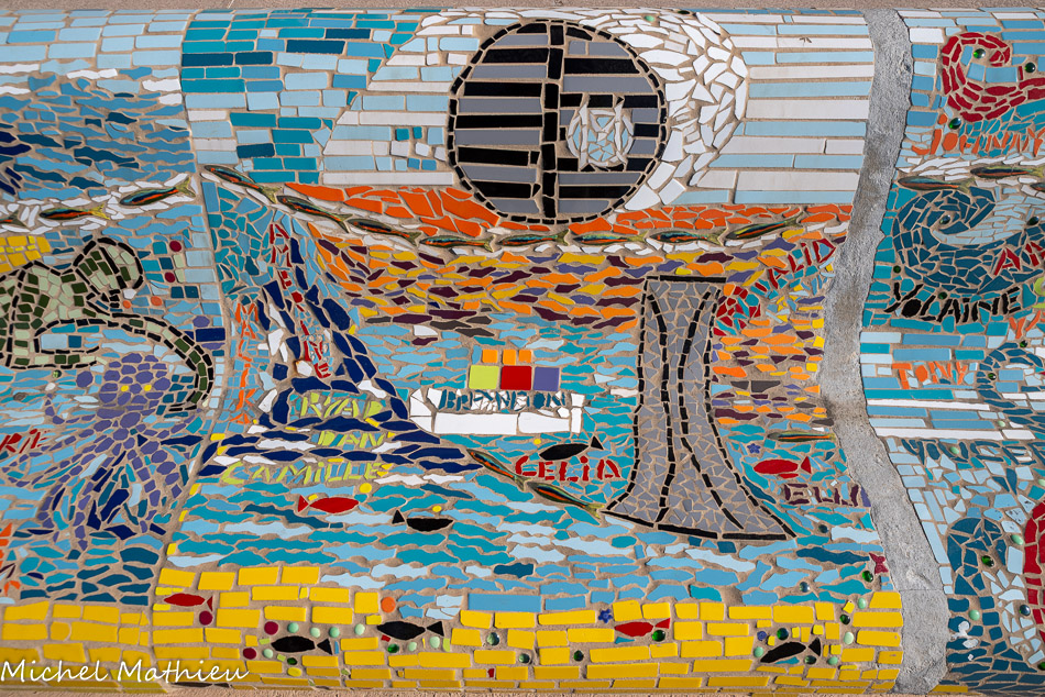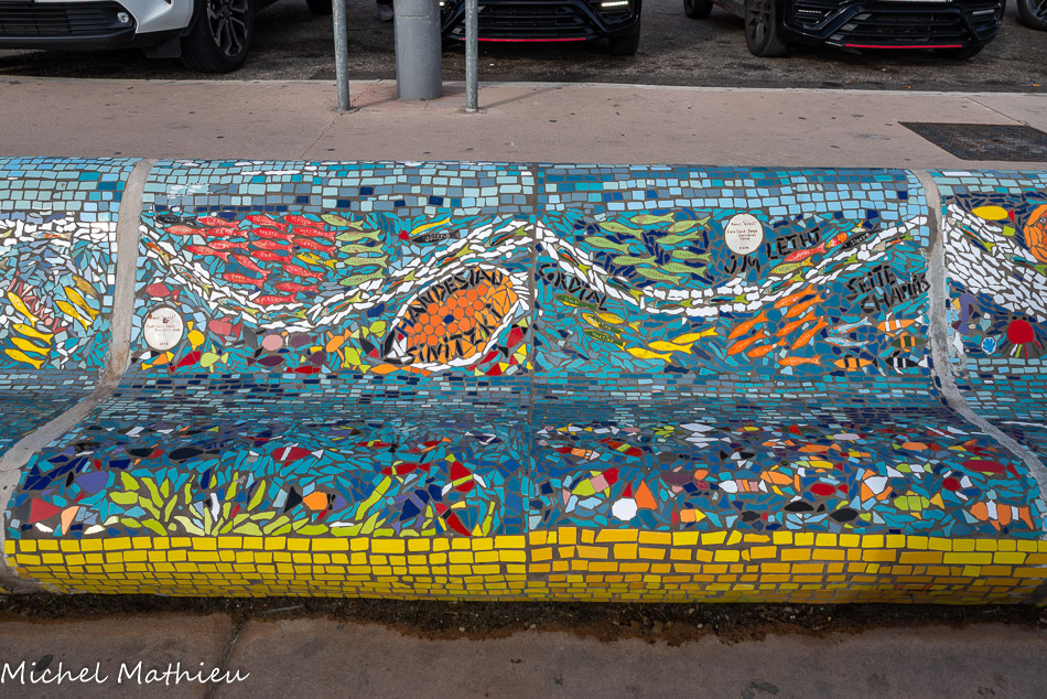 Bancs Ulule, Ecole Pharo-Catalans, 13007, 2019. Les petits poisons portent les noms de élèves.