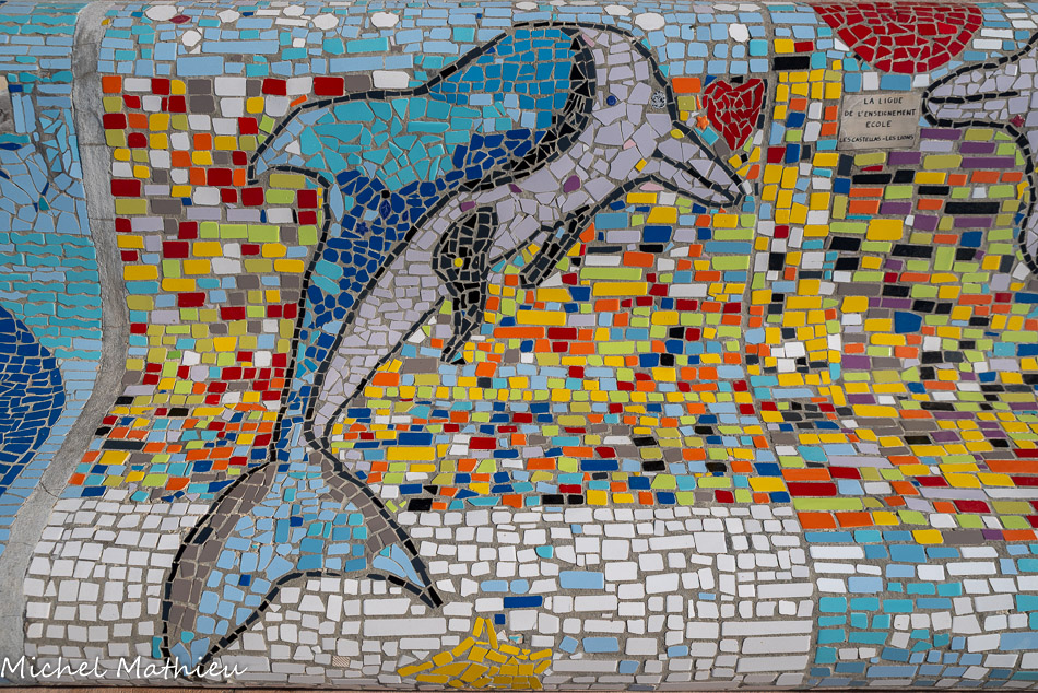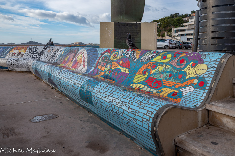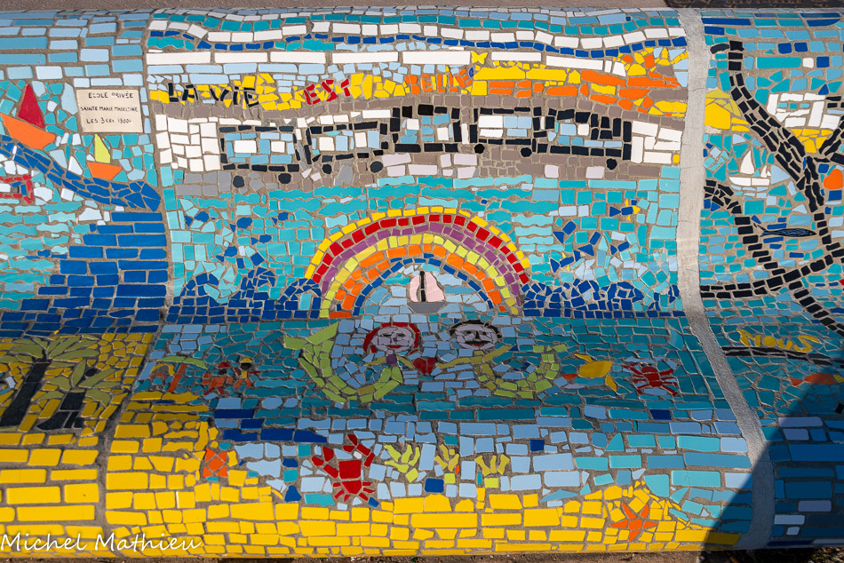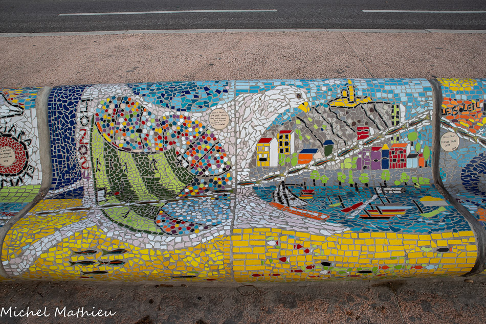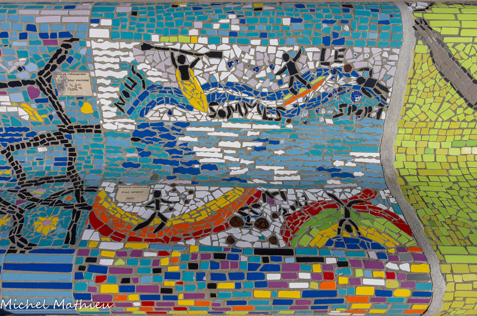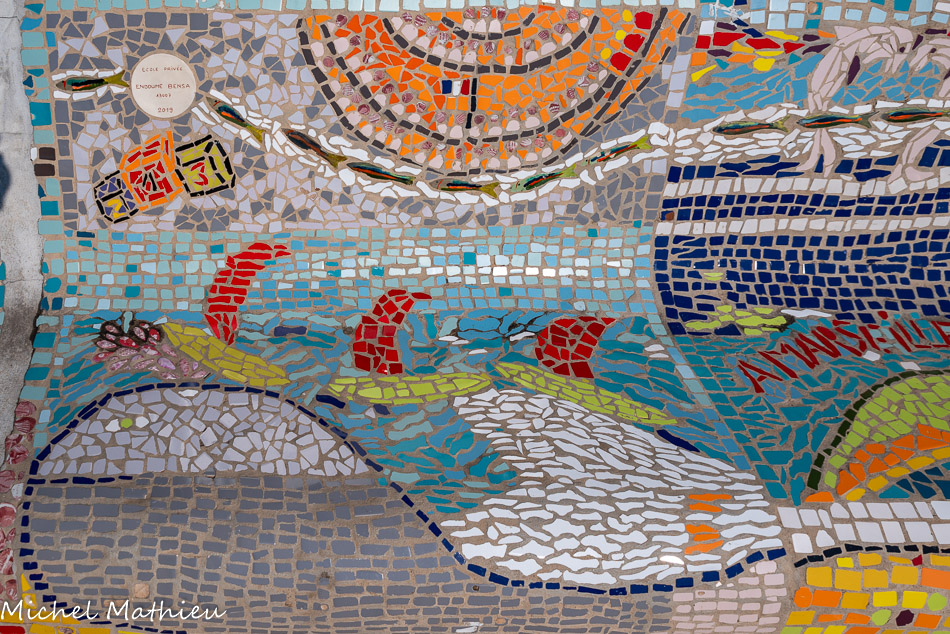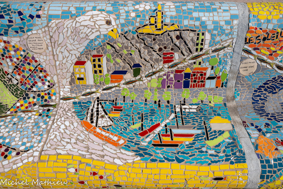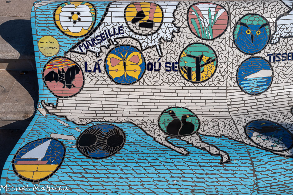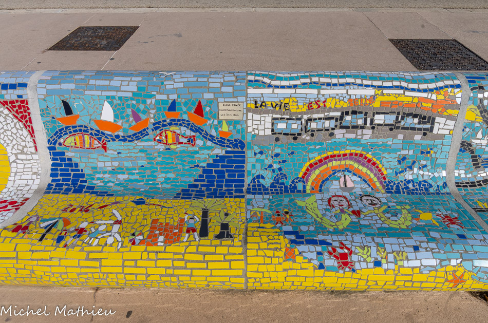 Bancs Ulule, Ecole Pharo-Catalans, 13007, 2019. Les petits poisons portent les noms de élèves.
