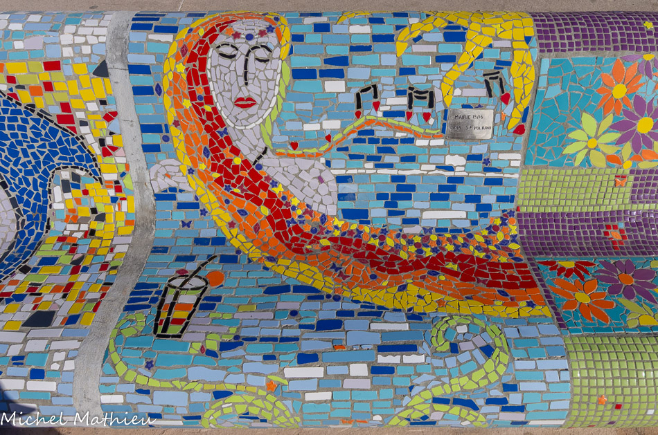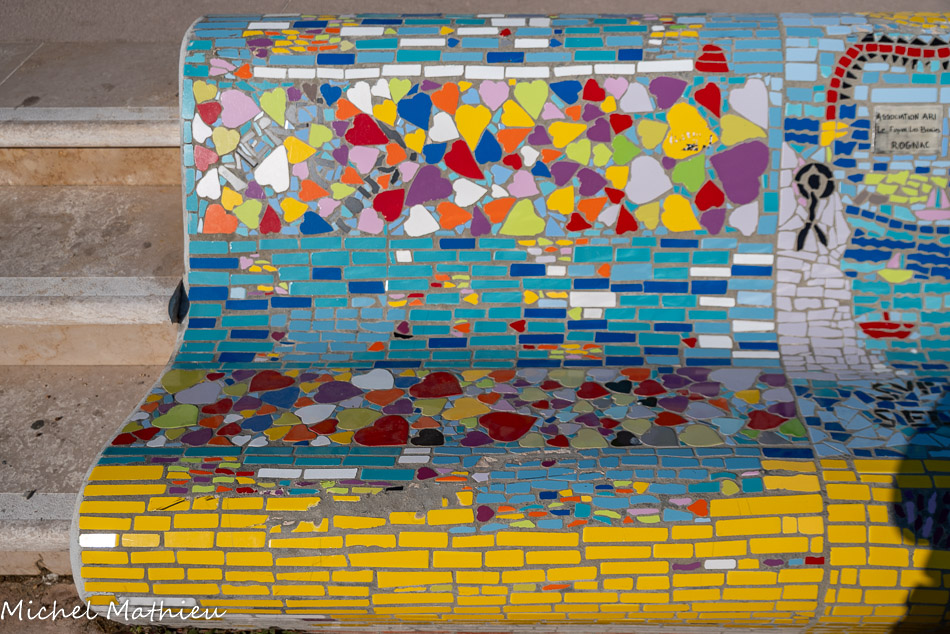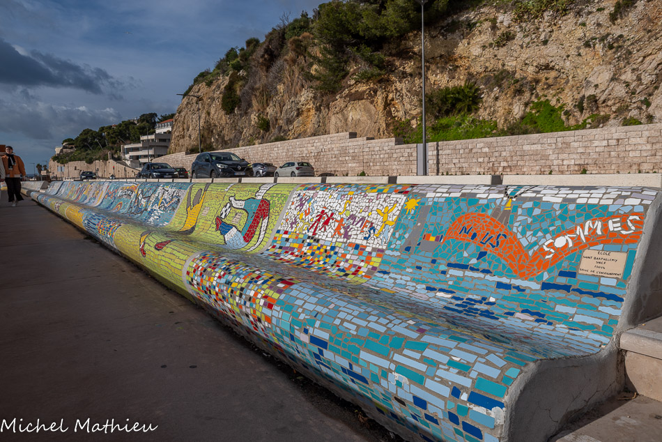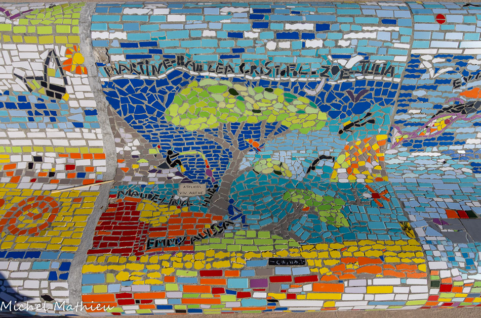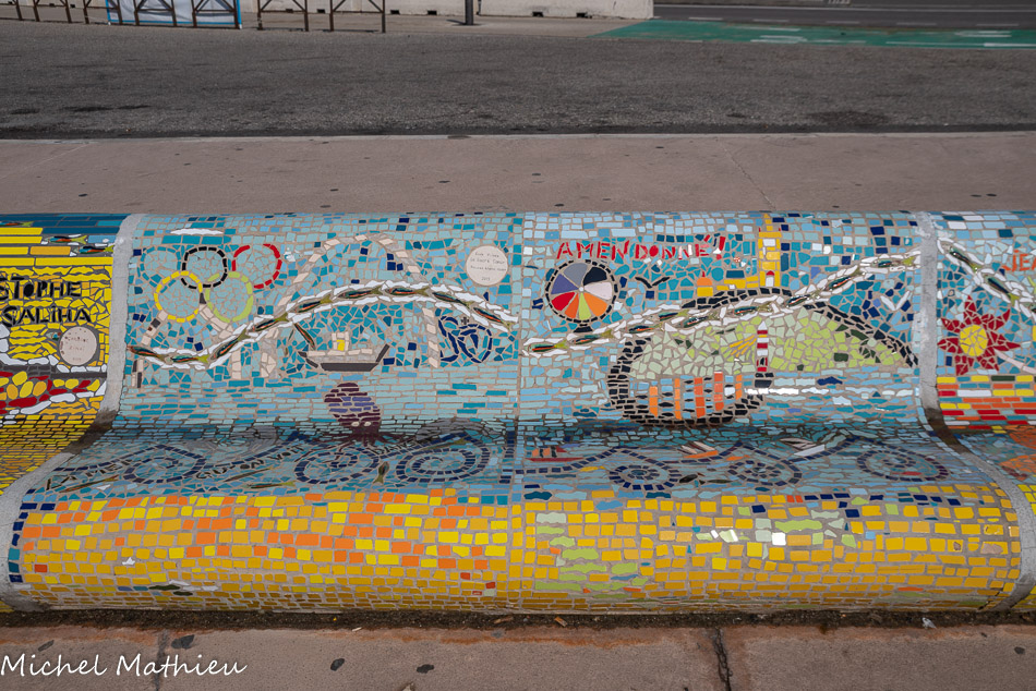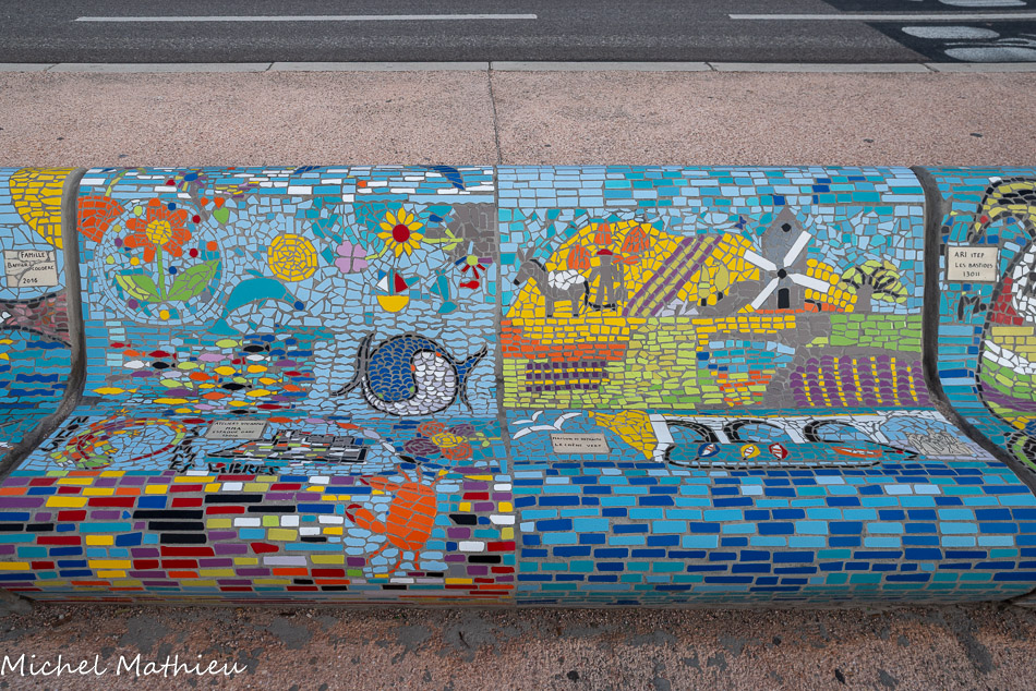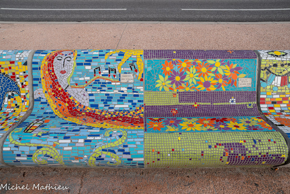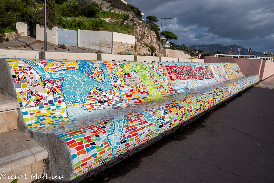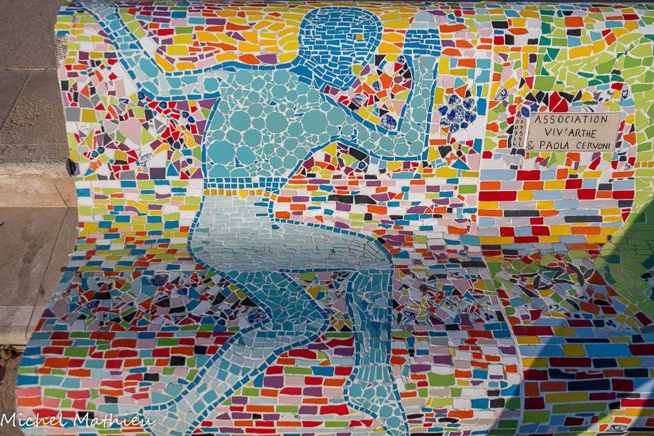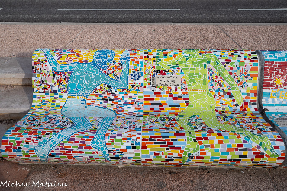 Depuis 2015, Paola Cervoni, à la tête de l’association Viv’arthe, aidée par 12 000 bén.évoles, habille le banc de mosaïques. Elle fait appel aux écoles, aux associations, aux familles. La création de la mosaïque se fait en atelier, mais ce sont toujours des bénévoles qui posent les fresques sur le banc de béton brut. Des sponsors ou des mécènes permettent la continuation de ce projet, ce qui a permis d'embaucher des jeunes céramistes. Depuis sa création il n'y a pas eu une seule dégradation.