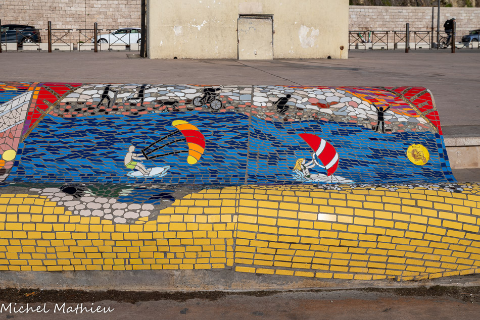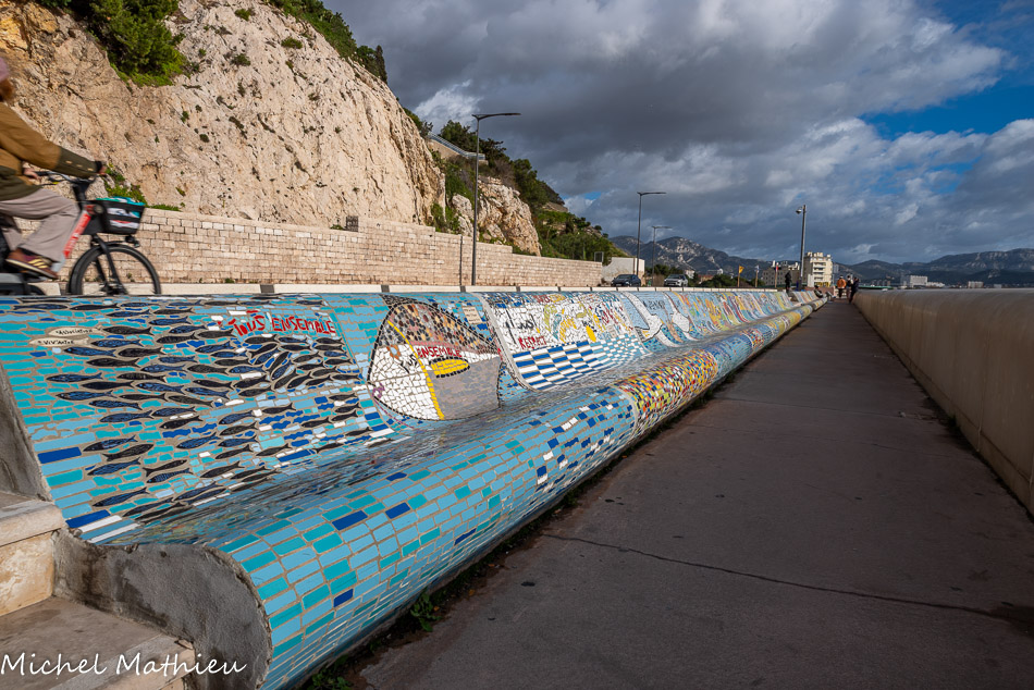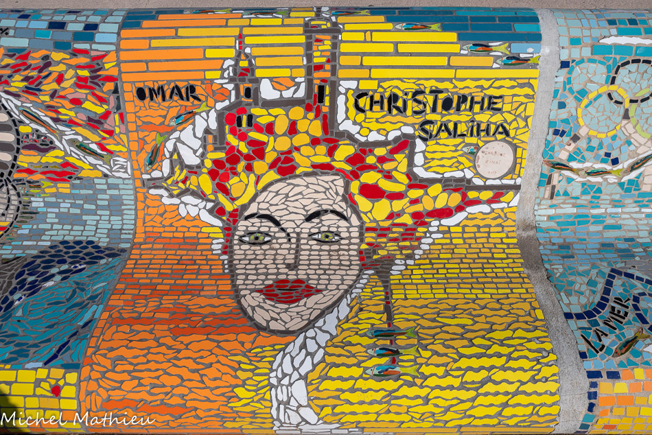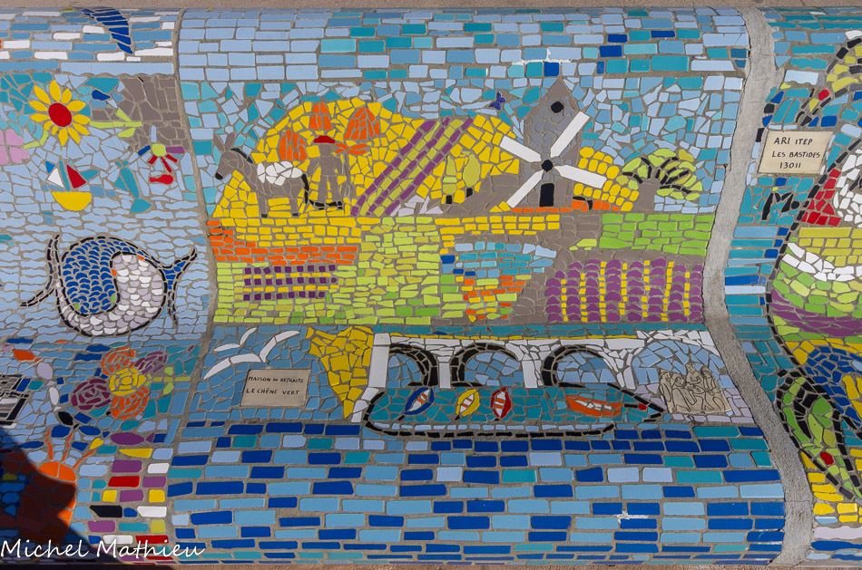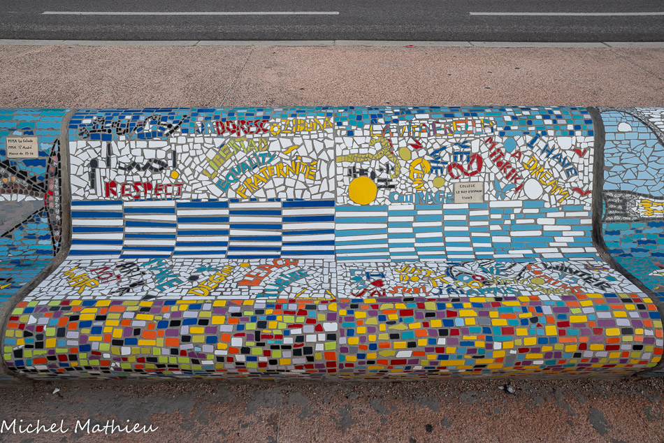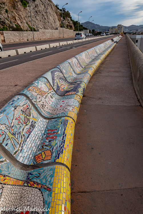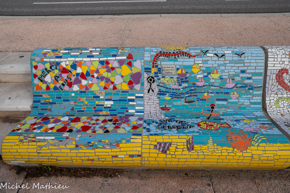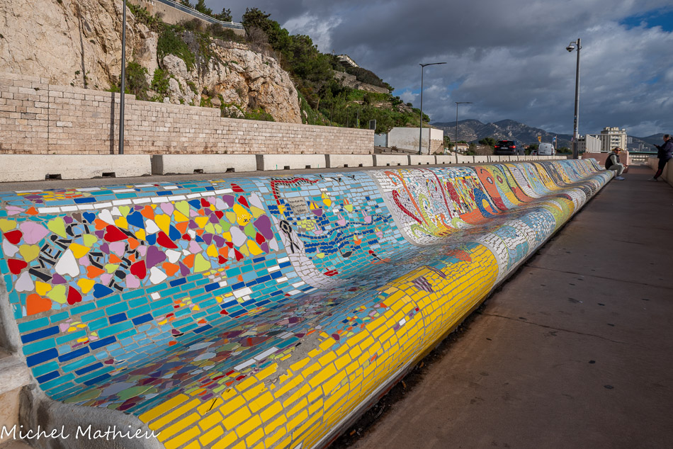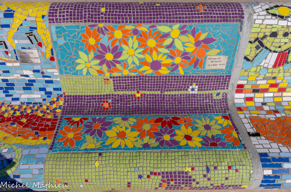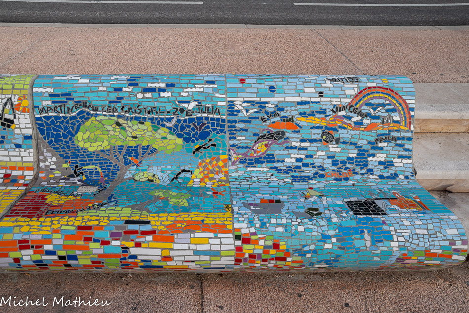 Depuis 2015, Paola Cervoni, à la tête de l’association Viv’arthe, aidée par 12 000 bén.évoles, habille le banc de mosaïques. Elle fait appel aux écoles, aux associations, aux familles. La création de la mosaïque se fait en atelier, mais ce sont toujours des bénévoles qui posent les fresques sur le banc de béton brut. Des sponsors ou des mécènes permettent la continuation de ce projet, ce qui a permis d'embaucher des jeunes céramistes. Depuis sa création il n'y a pas eu une seule dégradation.