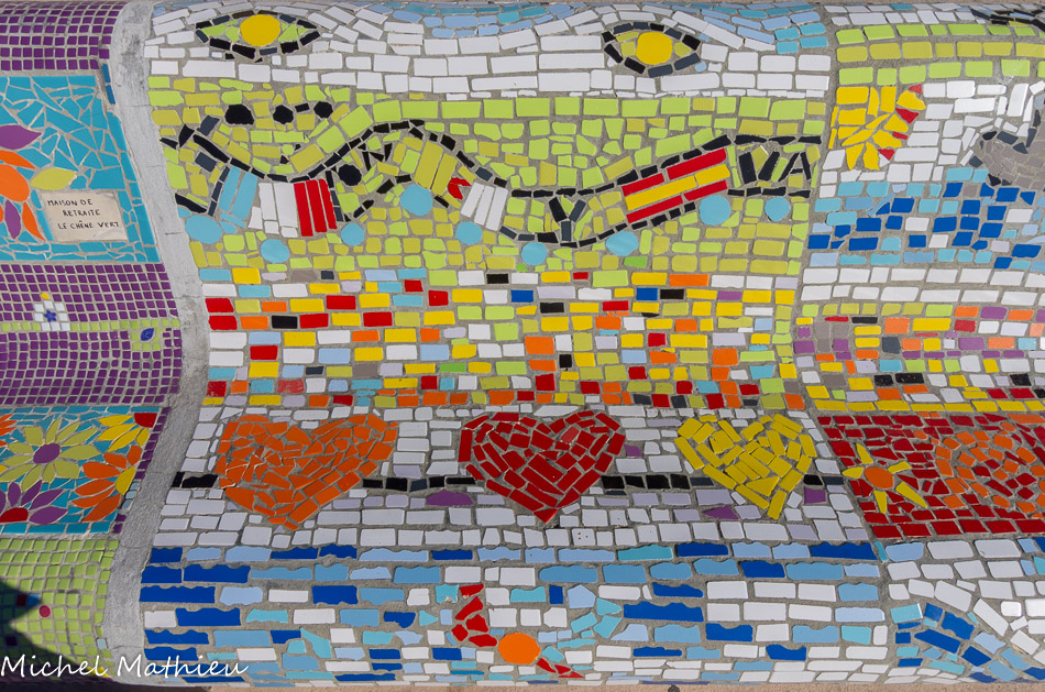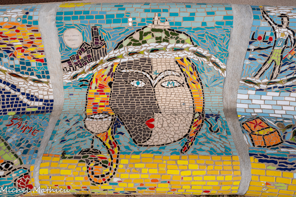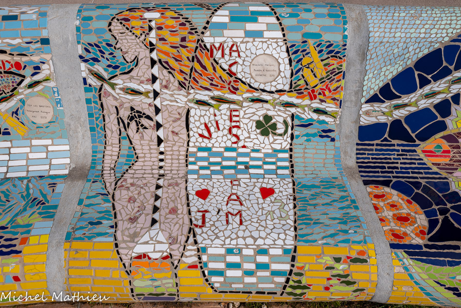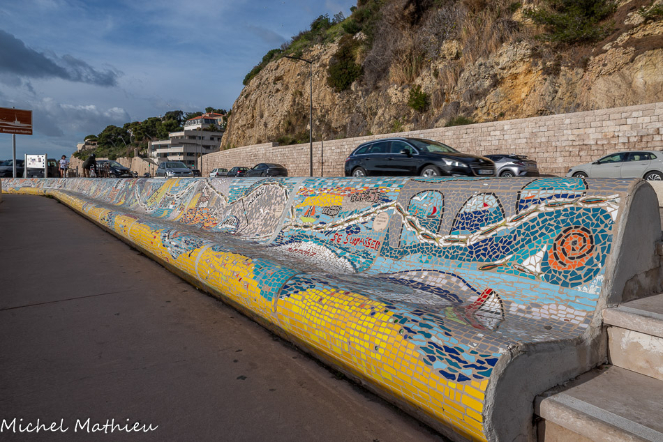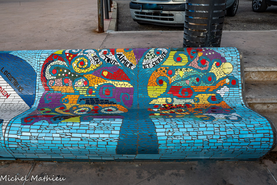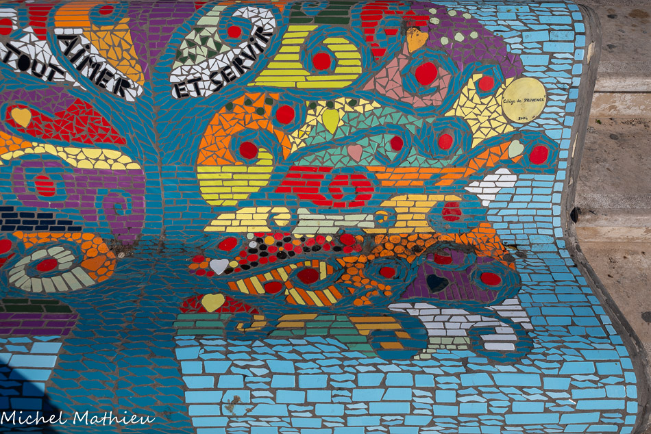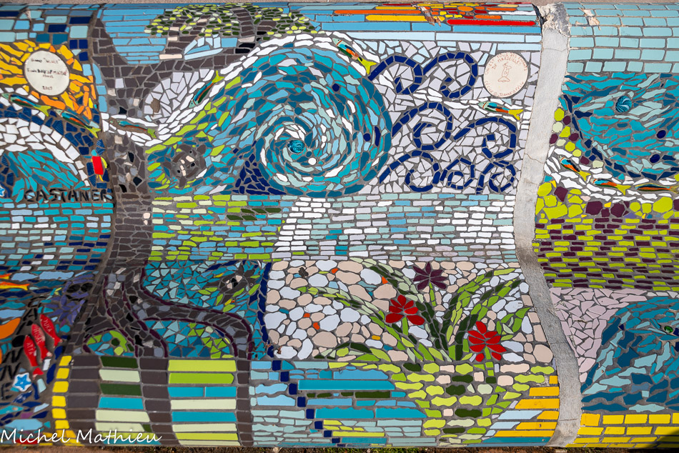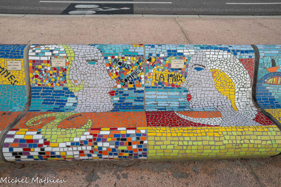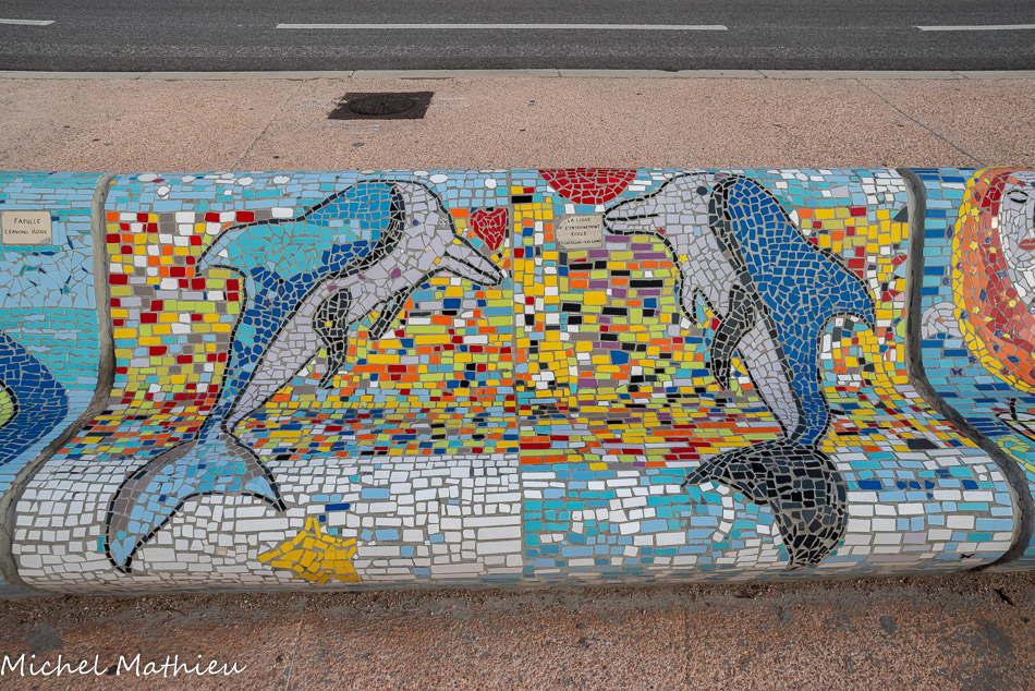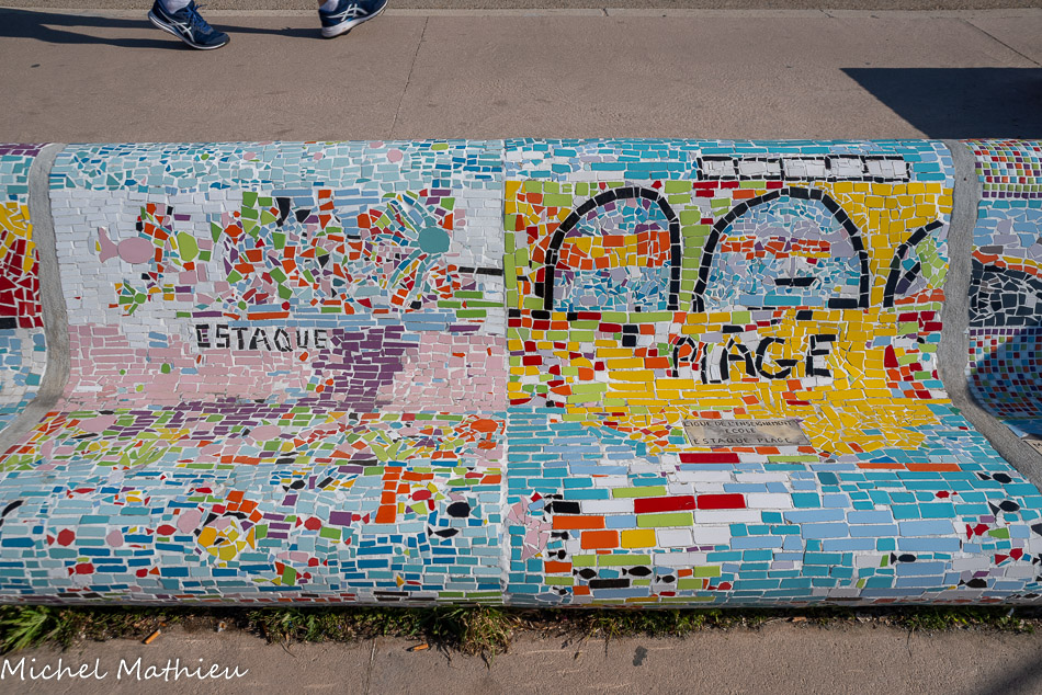 Depuis 2015, Paola Cervoni, à la tête de l’association Viv’arthe, aidée par 12 000 bén.évoles, habille le banc de mosaïques. Elle fait appel aux écoles, aux associations, aux familles. La création de la mosaïque se fait en atelier, mais ce sont toujours des bénévoles qui posent les fresques sur le banc de béton brut. Des sponsors ou des mécènes permettent la continuation de ce projet, ce qui a permis d'embaucher des jeunes céramistes. Depuis sa création il n'y a pas eu une seule dégradation.