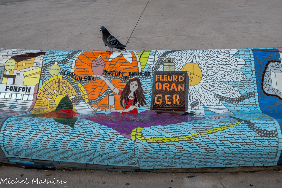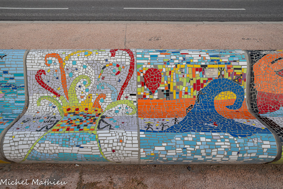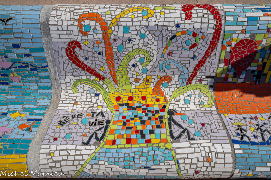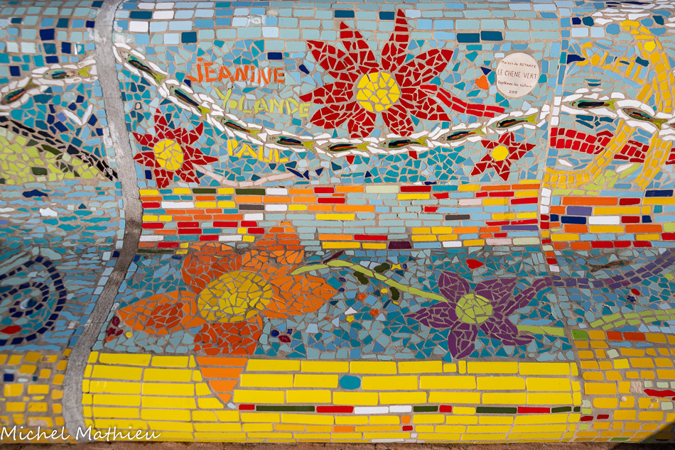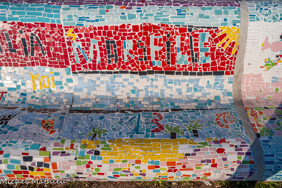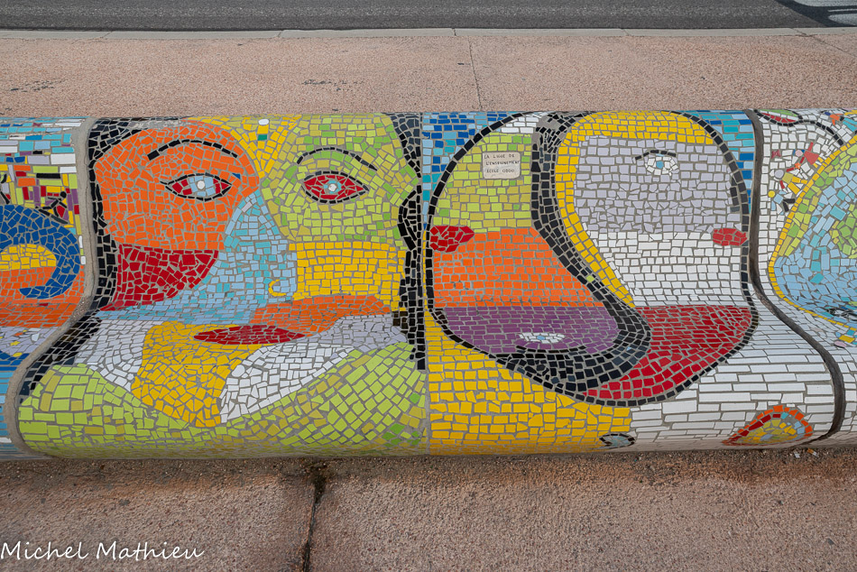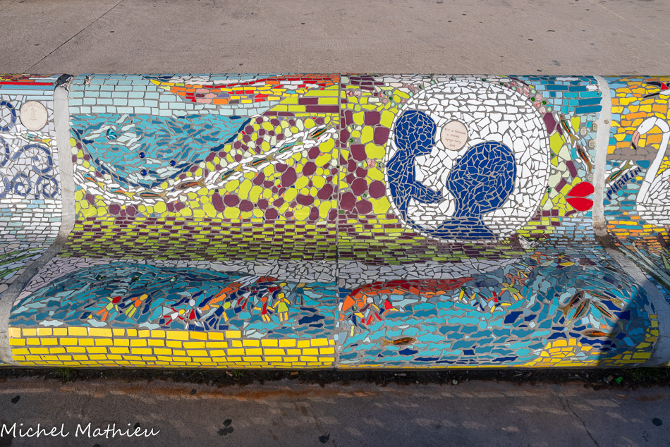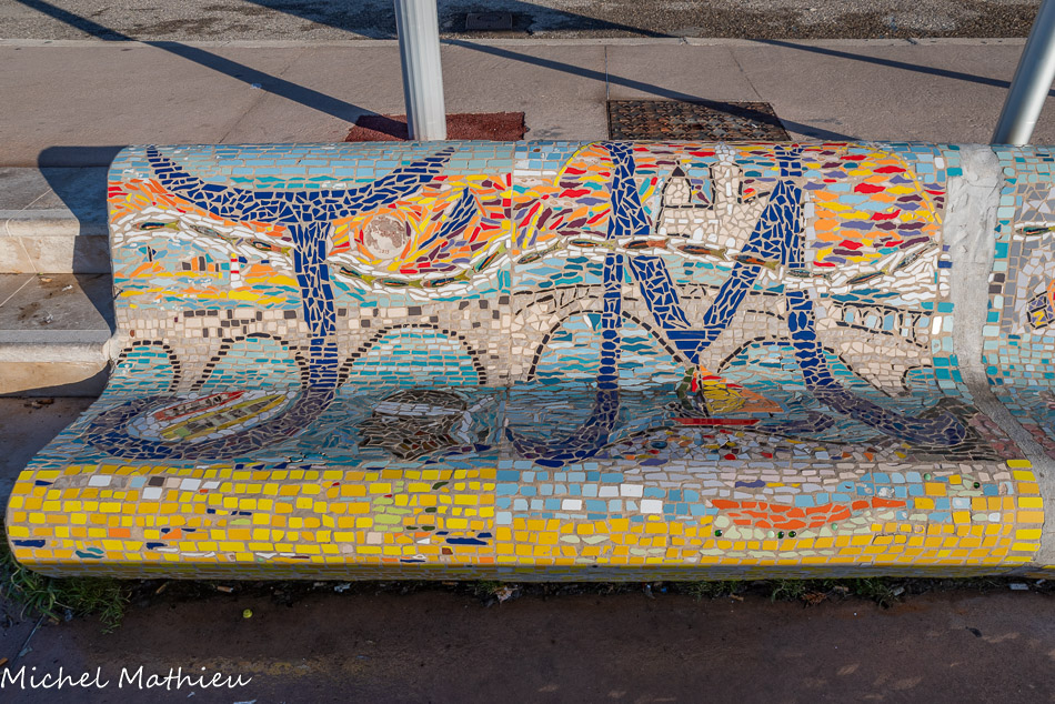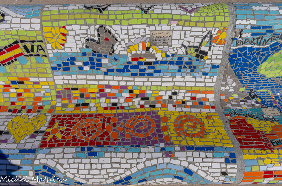 Depuis 2015, Paola Cervoni, à la tête de l’association Viv’arthe, aidée par 12 000 bén.évoles, habille le banc de mosaïques. Elle fait appel aux écoles, aux associations, aux familles. La création de la mosaïque se fait en atelier, mais ce sont toujours des bénévoles qui posent les fresques sur le banc de béton brut. Des sponsors ou des mécènes permettent la continuation de ce projet, ce qui a permis d'embaucher des jeunes céramistes. Depuis sa création il n'y a pas eu une seule dégradation.
