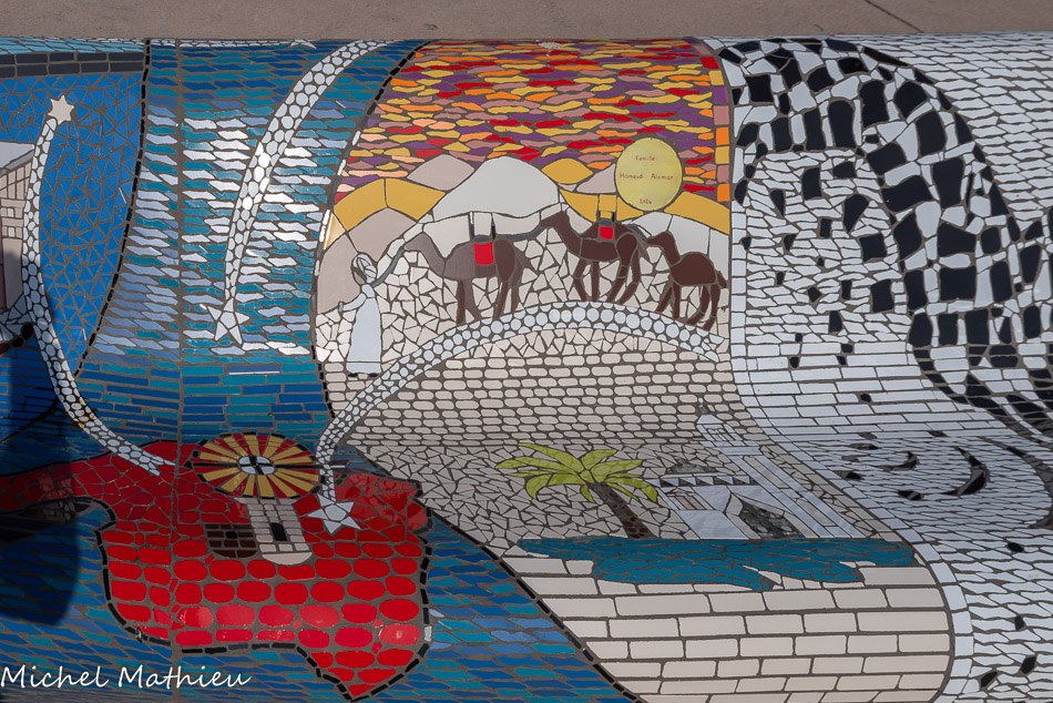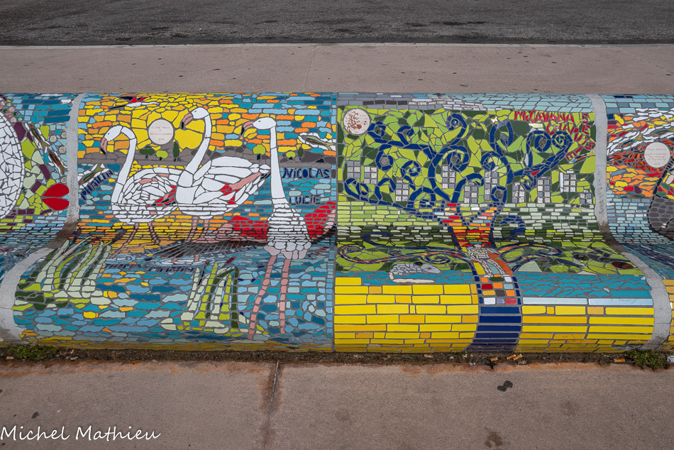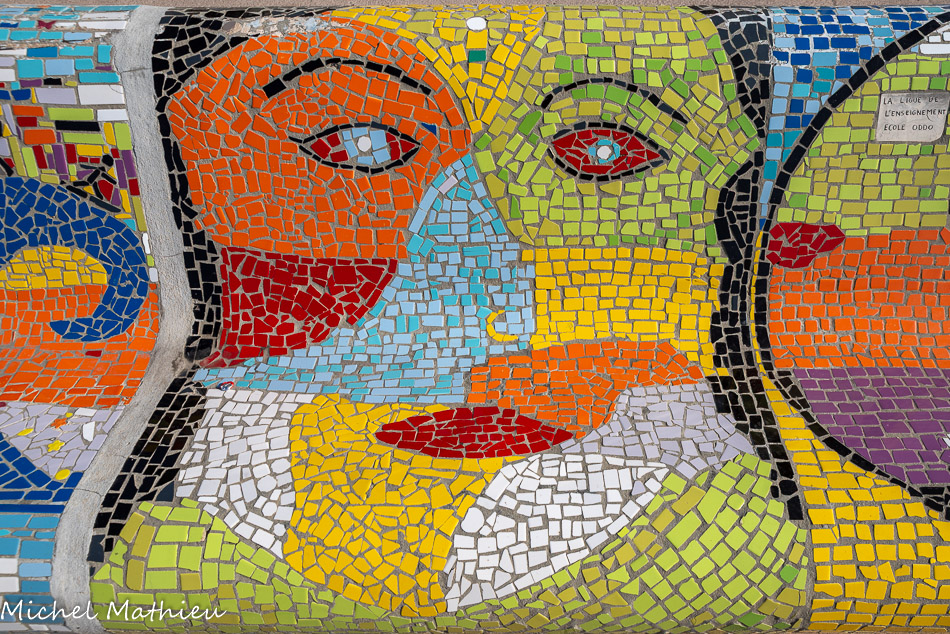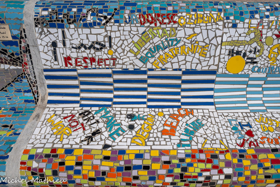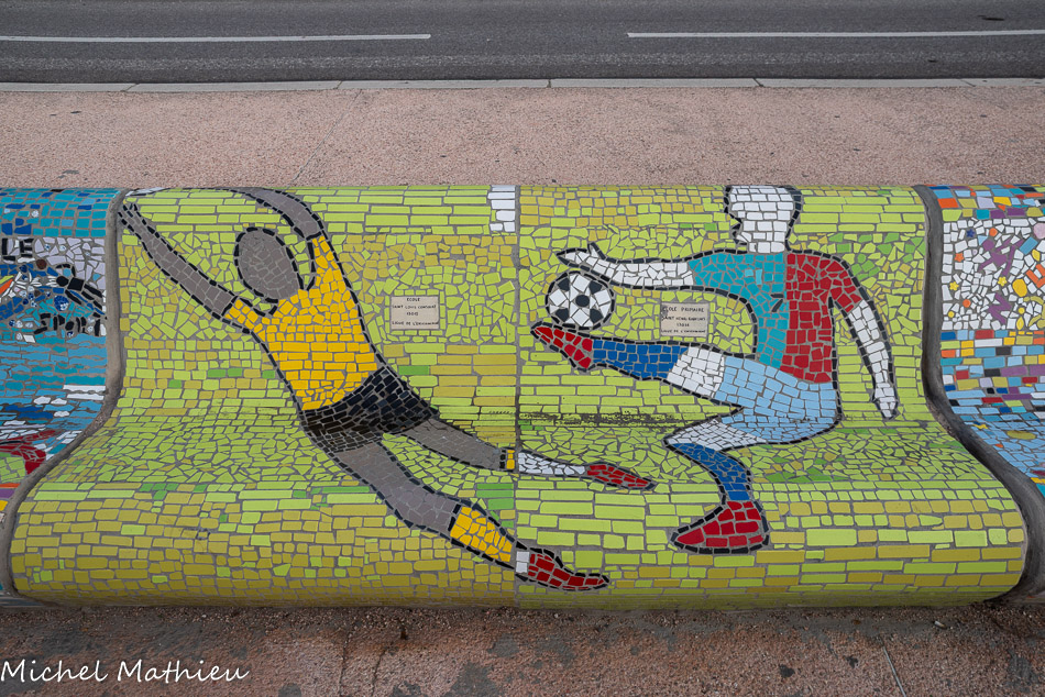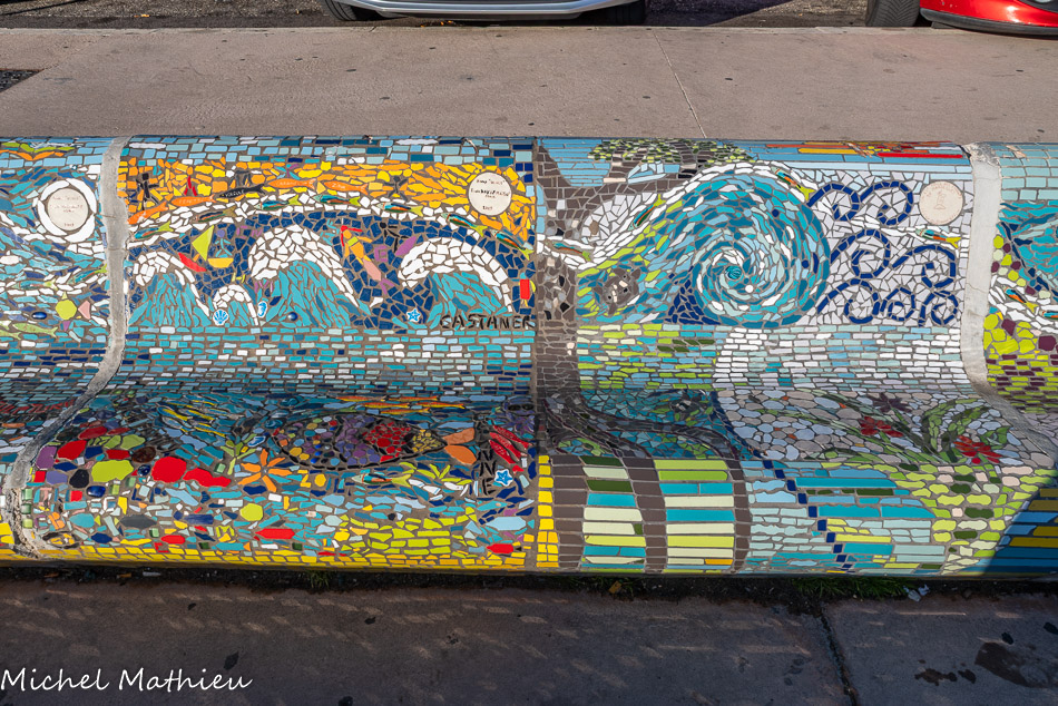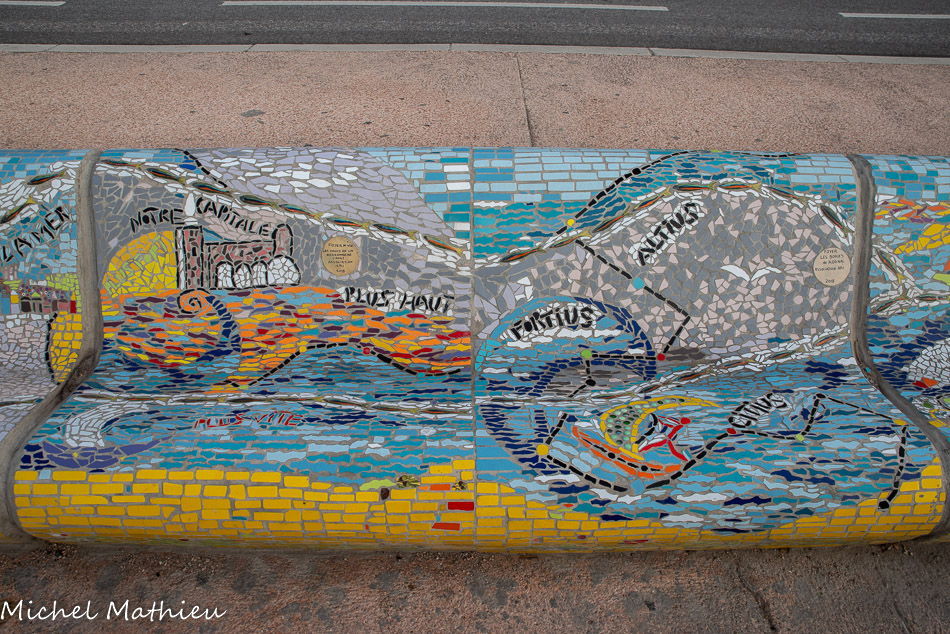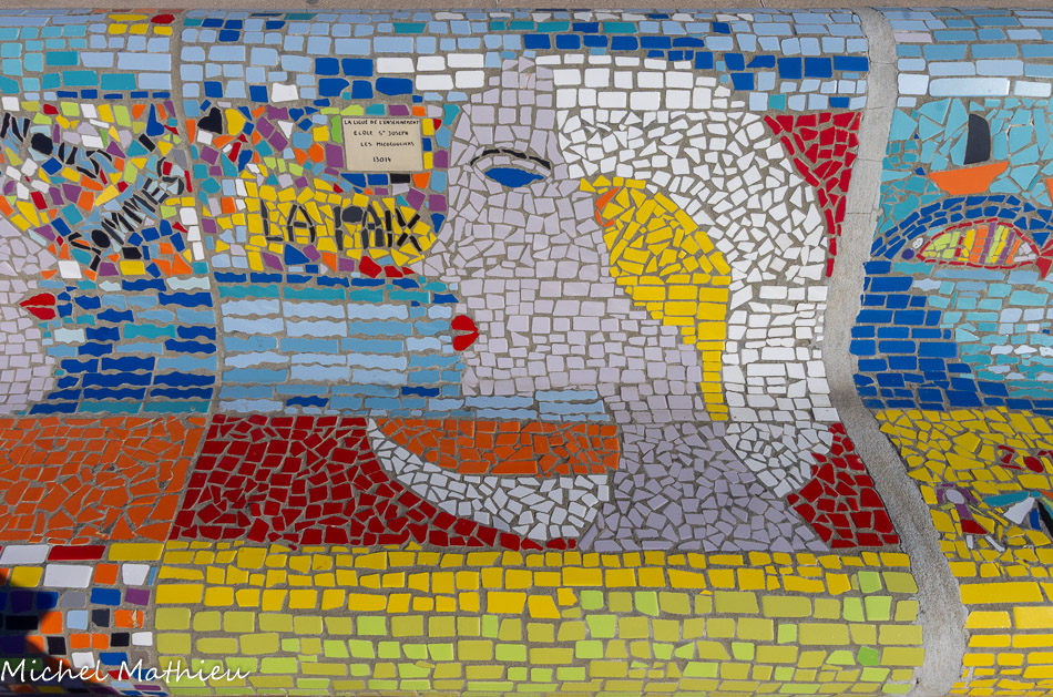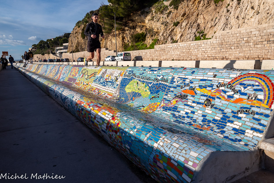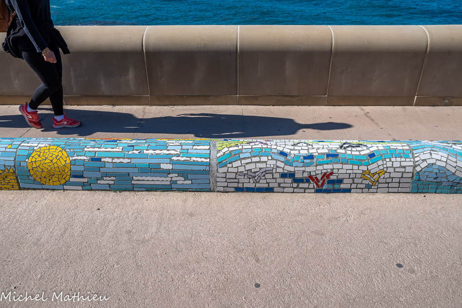 Depuis 2015, Paola Cervoni, à la tête de l’association Viv’arthe, aidée par 12 000 bén.évoles, habille le banc de mosaïques. Elle fait appel aux écoles, aux associations, aux familles. La création de la mosaïque se fait en atelier, mais ce sont toujours des bénévoles qui posent les fresques sur le banc de béton brut. Des sponsors ou des mécènes permettent la continuation de ce projet, ce qui a permis d'embaucher des jeunes céramistes. Depuis sa création il n'y a pas eu une seule dégradation.