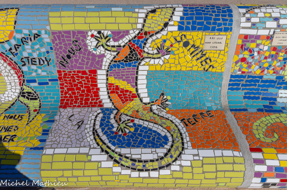 Bancs Ulule, Ecole Saint Joseph, Servières, 13015, 2019. Les petits poisons portent les noms de élèves. JM Letht Cordial Seite Chapuis.