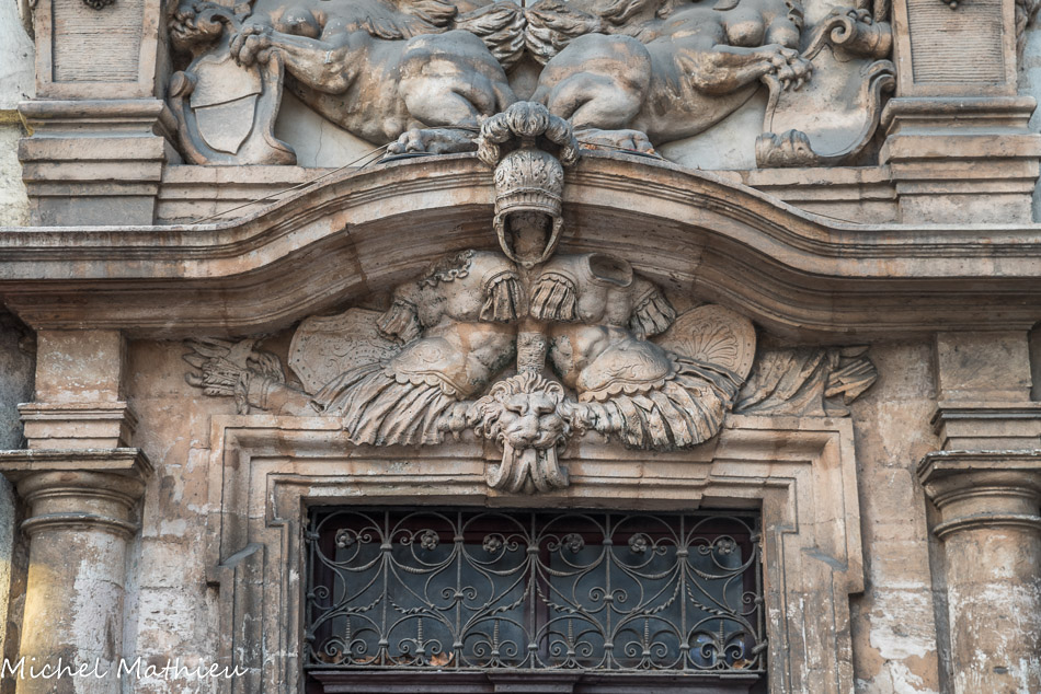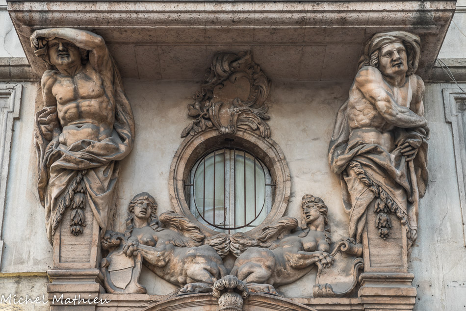Hôtel Pesciolini 1673. Le balcon est porté par deux atlantes encadrant l'œil-de-bœuf médian de l'entresol.