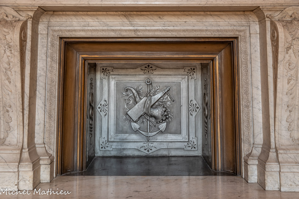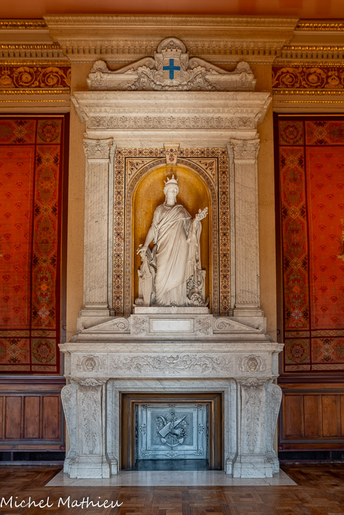 La cheminée monumentale en marbre ornée d'une statue du génie de la France fut sculptée par le Parisien Germain Gilbert en 1877.