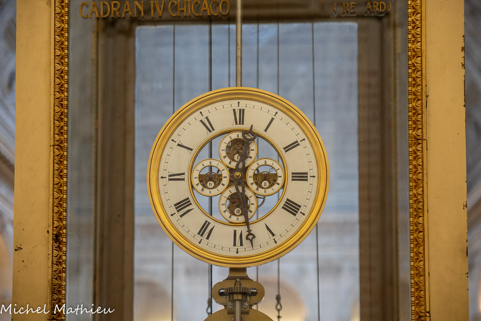 L'horloge. Quatre cadrans, sur sa face arrière, donnent l'heure en Europe centrale, à Saïgon, en Europe orientale, et à Chicago. Elle commande aussi le carillon.