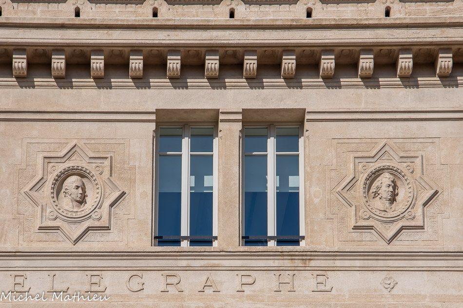 Sur la façade, on peut voir, de gauche à droite, les médaillons de Volta, Ampère, Faraday et Coulomb, des savants qui ont travaillé dans le domaine de l'électricité, leurs découvertes ayant préludé à l’invention du télégraphe. Ils sont dus au sculpteur Stanislas Clastrier (1857-1925). A chaque extrémité, les emblêmes de la poste (des cercles ailés) encadrant les lettres RF. Les appuis des grandes croisées du premier étage sont nornés des écussons des principales villes du département, se détachant sur des feuillages rappelant la végétation de leur région respective.