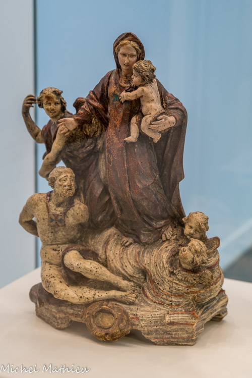 Reliquaire de l'ordre des trinitaires. Anonyme XVIIe siècle. Bois polychrome. Lors des razzias en Méditerranée des prisonniers destinés à l'esclavage et aux galères étaient capturés. Une des missions de l'Ordre des Trinitaires, à la croix bleue et rouge, était le rachat des chrétiens au Levant et en Barbarie.