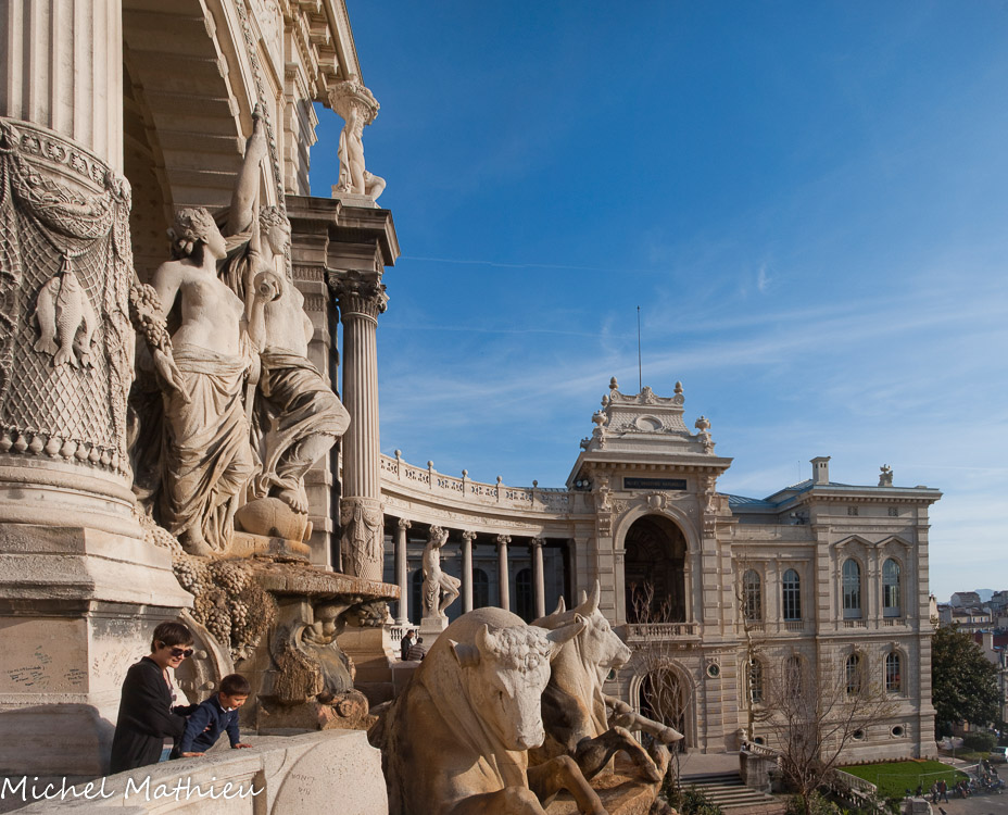 Les travaux commencèrent 15 ans après l'arrivée de l'eau en 1863. L'architecte Espérandieu sut merveilleusement tirer parti de la dénivellation. Le palais couronne ainsi le plateau Longchamp et le château d'eau en occupe le centre.