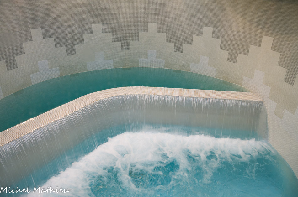 Le gaz est diffusé dans les cuves de 6 m de hauteur au travers de disques poreux. En la traversant, les bulles d'ozone, très petites dans le bas de la cuve, achèvent la purification de l'eau, qui rejoindra ensuite la vasque de présentation avant d'être stockée puis distribuée. La durée de contact entre l'eau et l’ozone est de six minutes. Il ne faut pas qu'il y ait du chlore lors de l'ozonation.