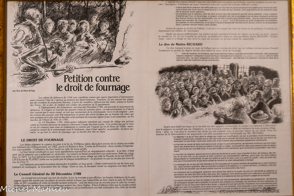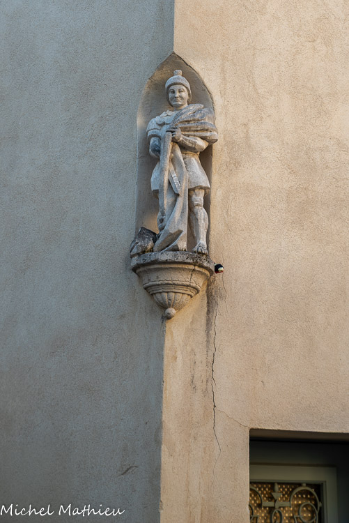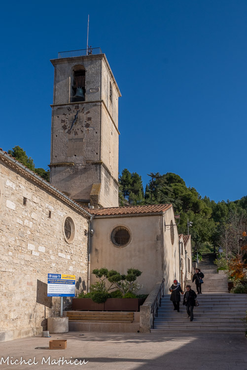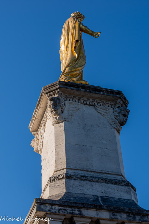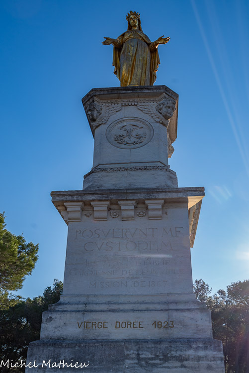 La Vierge dorée. En 1844, une première mission du curé Bonifait permit d'édifier le calvaire. En 1867, nous, moines Capucins, prêchons la parole de Dieu afin de ranimer la foi des Châteaurenardais. Ensemble nous érigeons la statue de la Vierge dorée. Ce n'est pas une mince affaire car elle pèse 1860 kg ! Cela nécessite le concours de nombreux hommes et mulets. Sur son socle on peut lire « ils m'ont établi gardienne de la ville ».