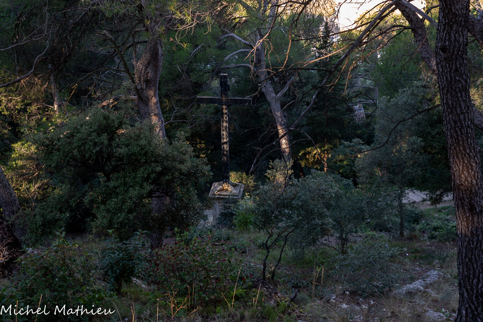 Sur le chemin qui monte au Pic Chabaud, ce calvaire majestueux au milieu de la pinède fut érigé à la force des bras, par les paroissiens en 1884.