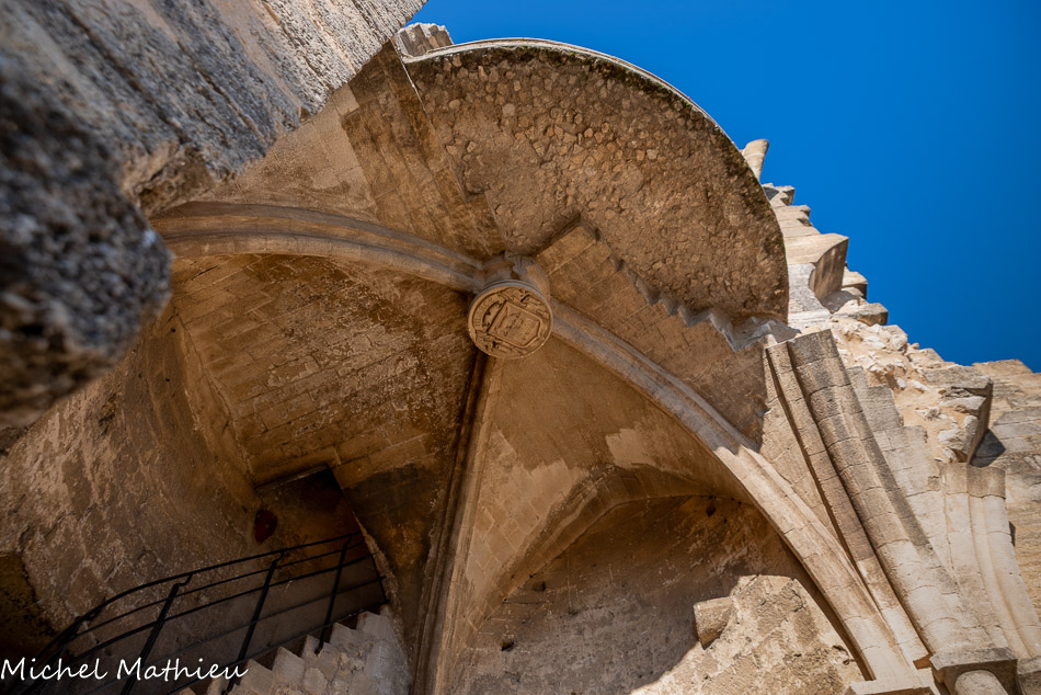 Vue du sommet de la Tour du Griffon. Le chemin de la courtine qui pemet d'accéder à la Tour des trois Poignards.
