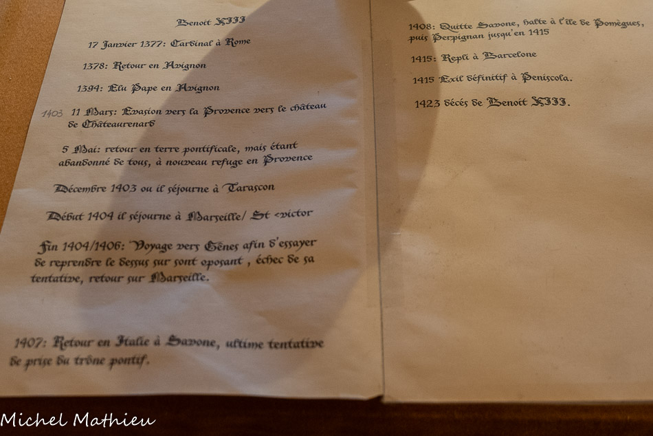 Salle Benoît XIII, dernier pape avignonnais ayant trouvé refuge à Châteaurenard au rez-de-chaussée de la Tour des 3 Poignards. Pedro de Luna (alors appelé pape Benoît XIII) y trouva refuge en 1403 après s'être enfui d'Avignon. Au XVe siècle, le pape Benoît XIII alors en poste sur Avignon vient se réfugier à Châteaurenard pour échapper au siège du palais des Papes mené par Charles VI.