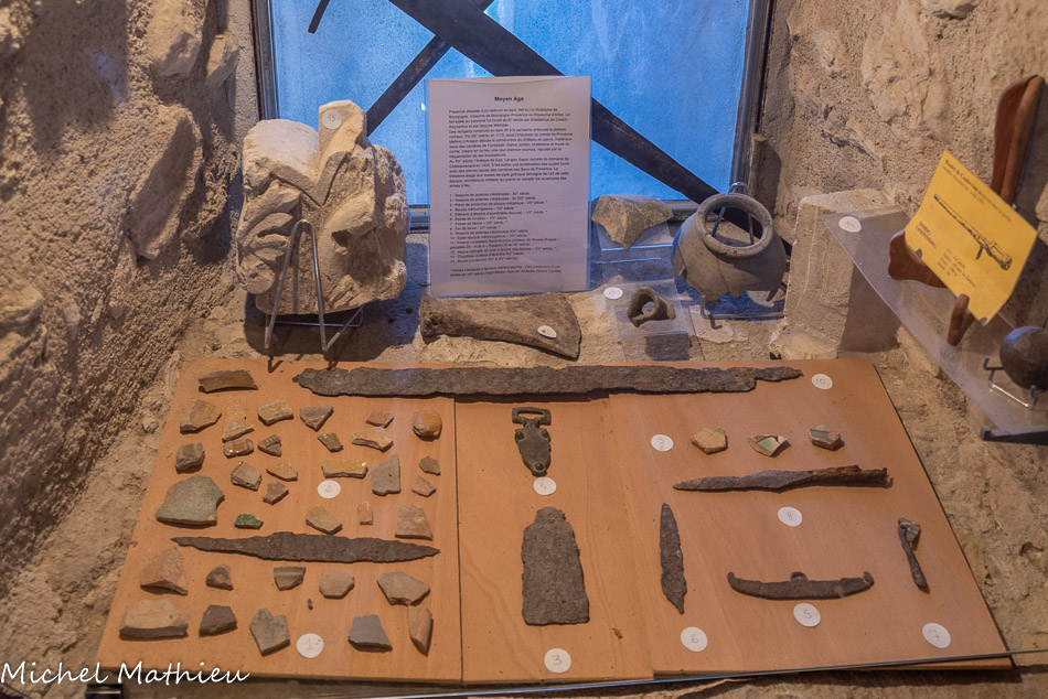 Base de la Tour de l'Aigle. Le château est construit sur la base d’un trapèze fortifié, cantonné de 4 tours. Parmi les différents propriétaire du château, on trouve le nom de Valori. Gabriel Valori était chevalier au service de la Reine Jeanne, Comtesse de Provence au XIVe siècle. En remerciement des services rendus, la Comtesse lui inféodat le château et ses terres. Gabriel Valori fit construire (ou transformer) la tour située dans l'angle sud-est du donjon.