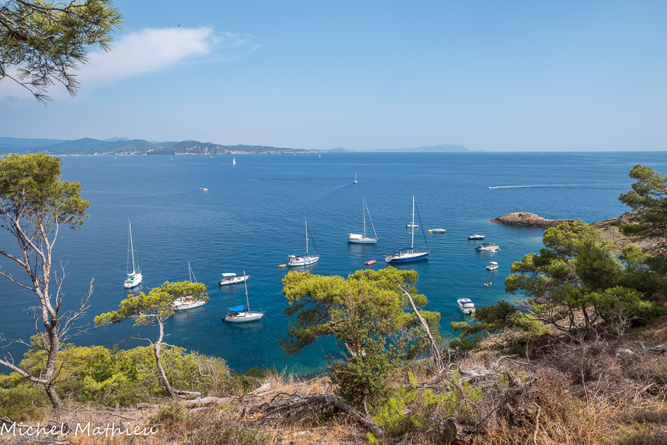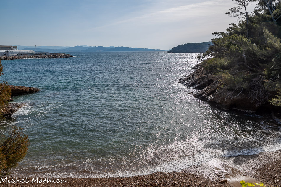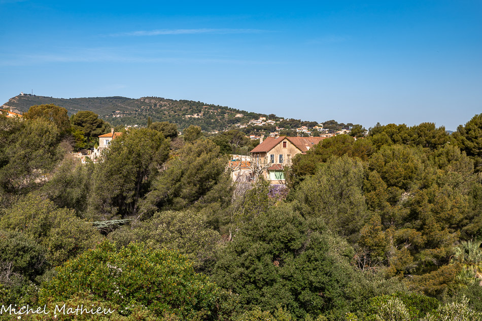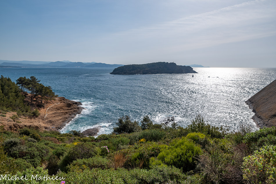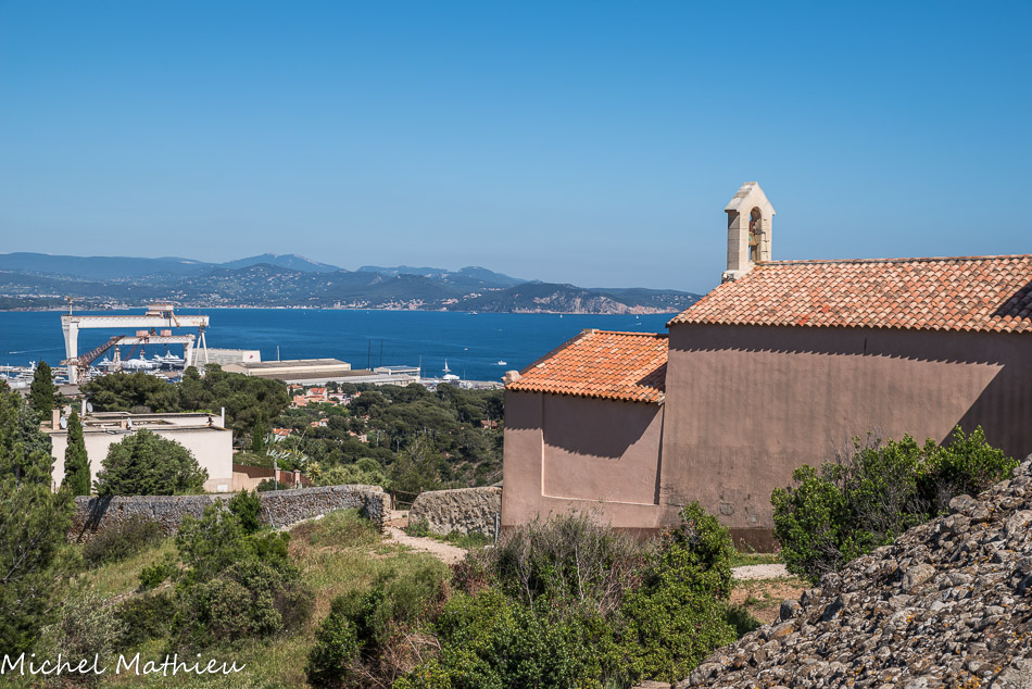L'île Verte et la tour du Canonnier du Sud. Au fond, de gauche à droite : la Sainte Baume, La Cadière d'Azur, Le Castellet, le Mont Caume, le Faron, la presqu'île de Port d'Alon, à droite de l'île, le cap Sicié et les îles des Embiez.