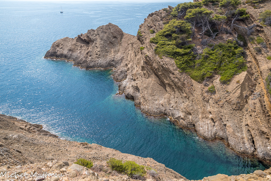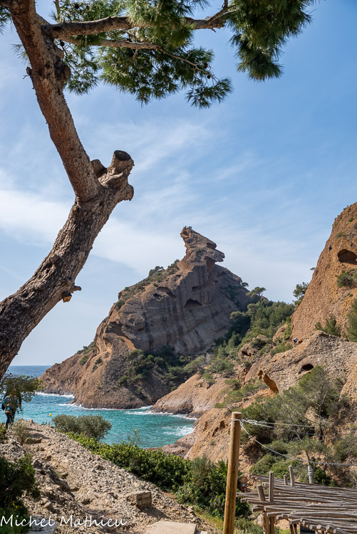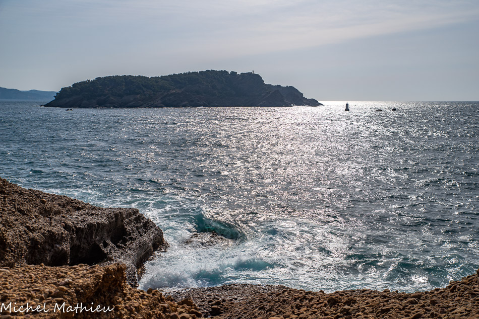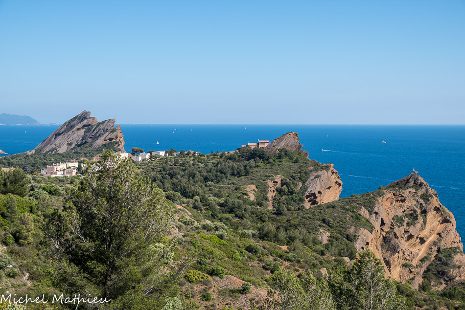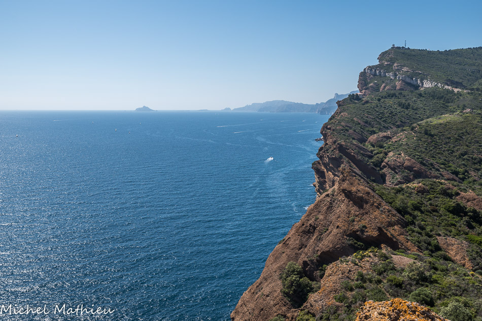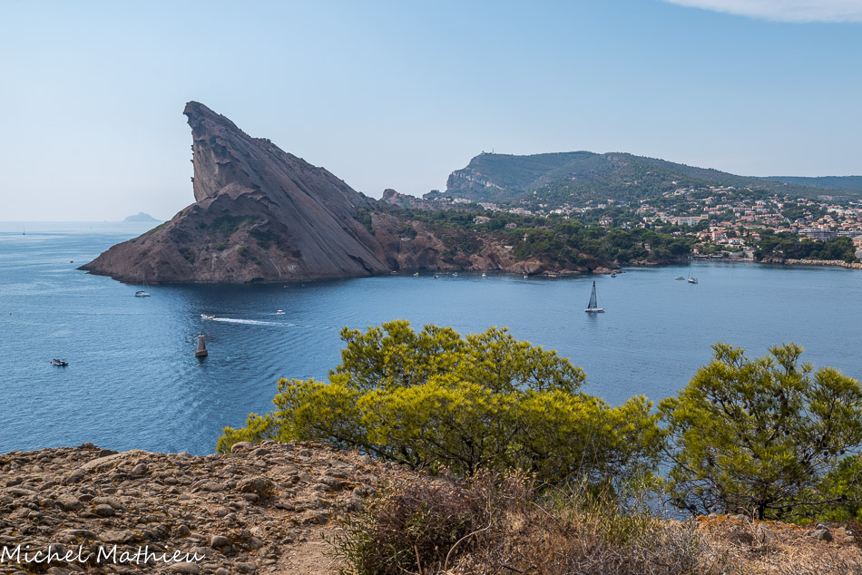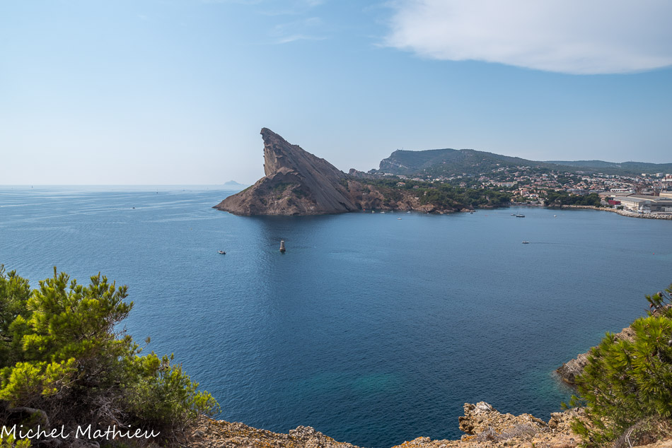 Au fond, le Bec de l'Aigle, et derrière, l'île Verte. Au centre, le Rocher du Capucin avec, à gauche, un bout de la calanque de Figuerolles.