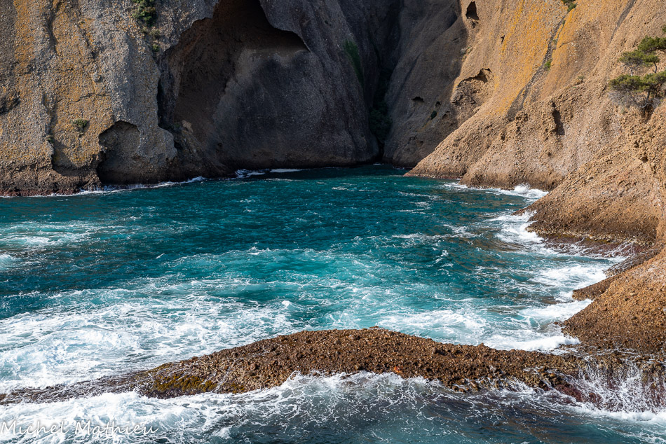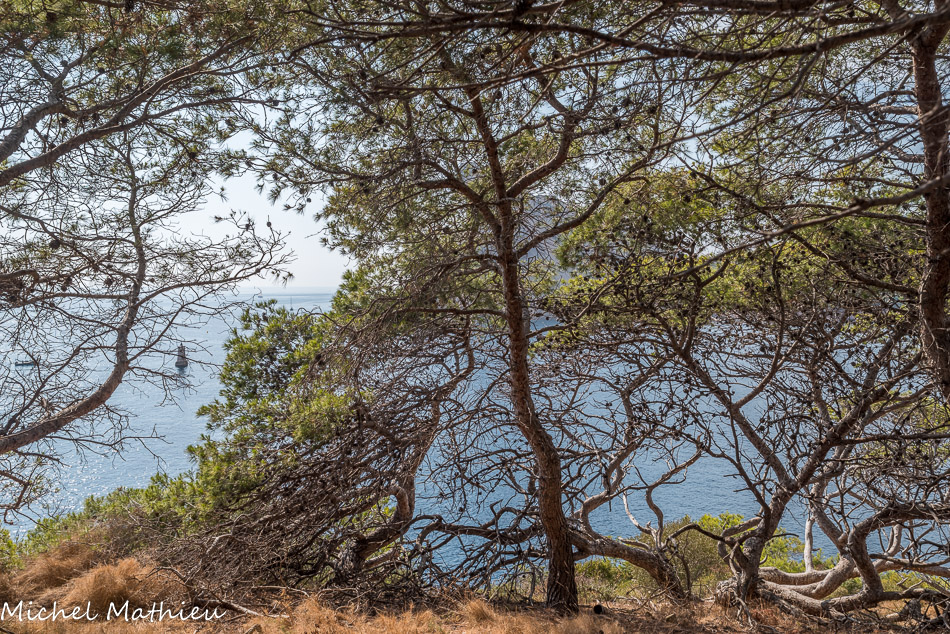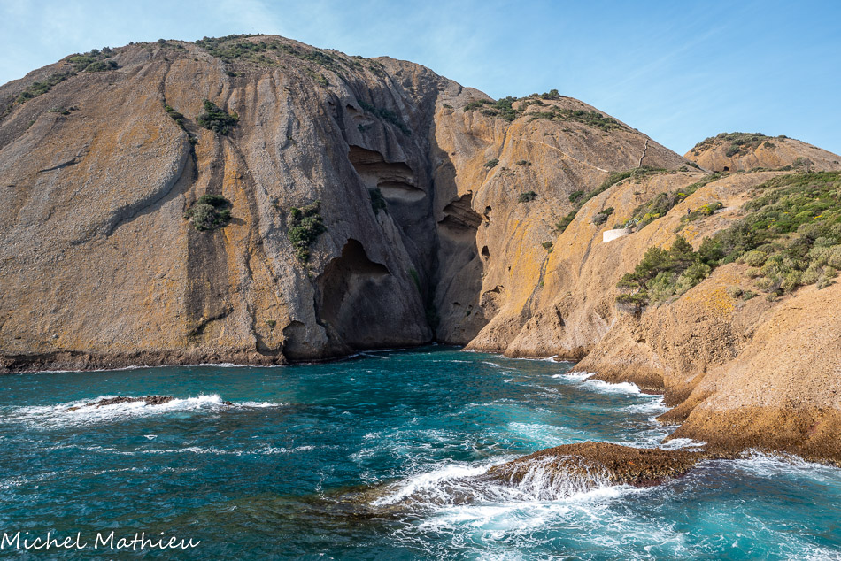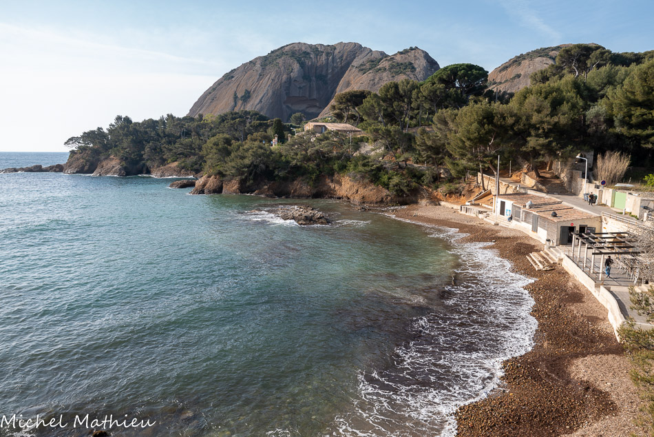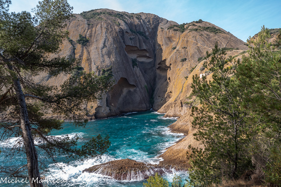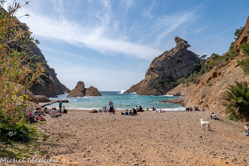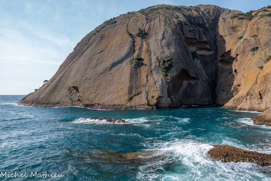 Au fond, le Bec de l'Aigle, et derrière, l'île Verte. Au centre, le Rocher du Capucin avec, à gauche, un bout de la calanque de Figuerolles.