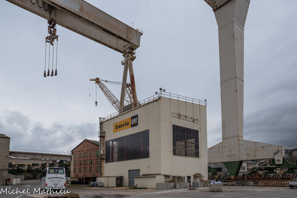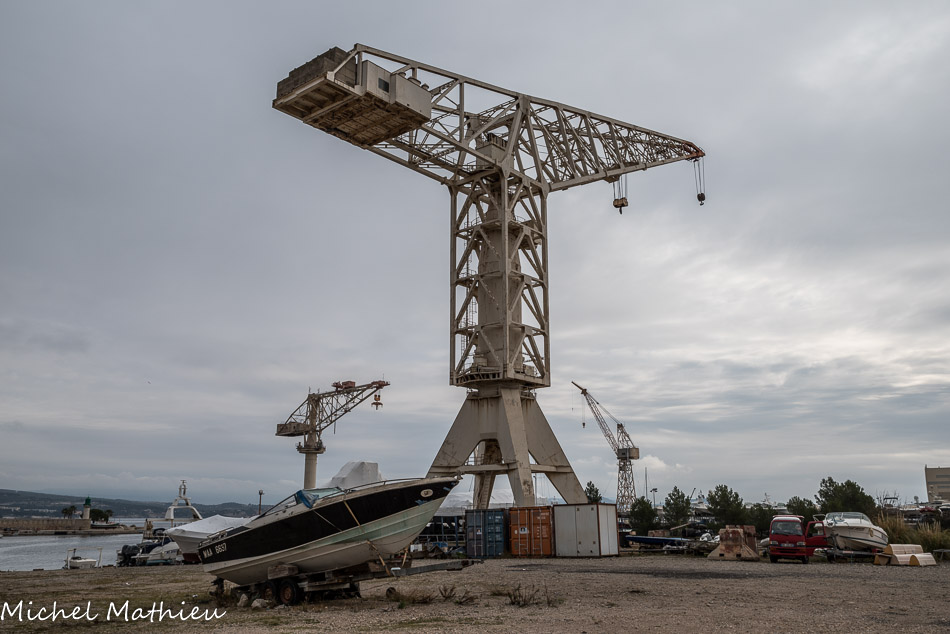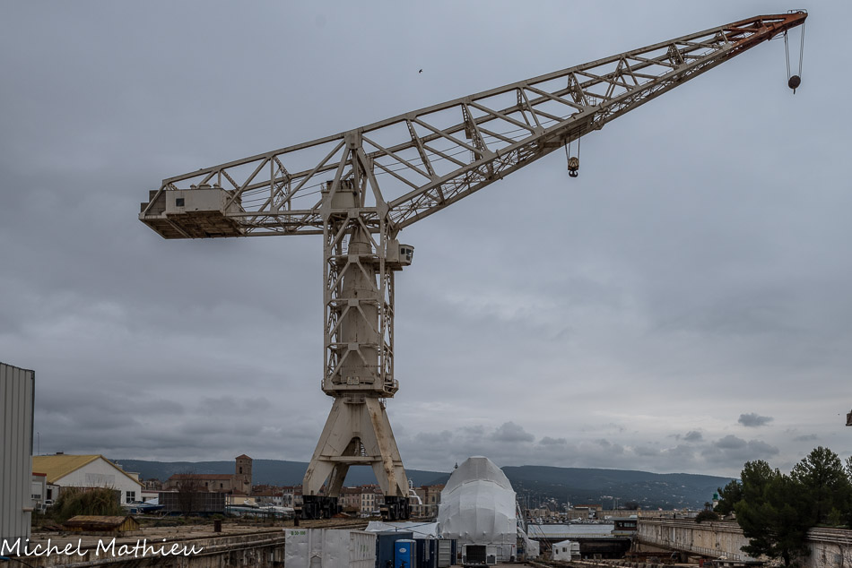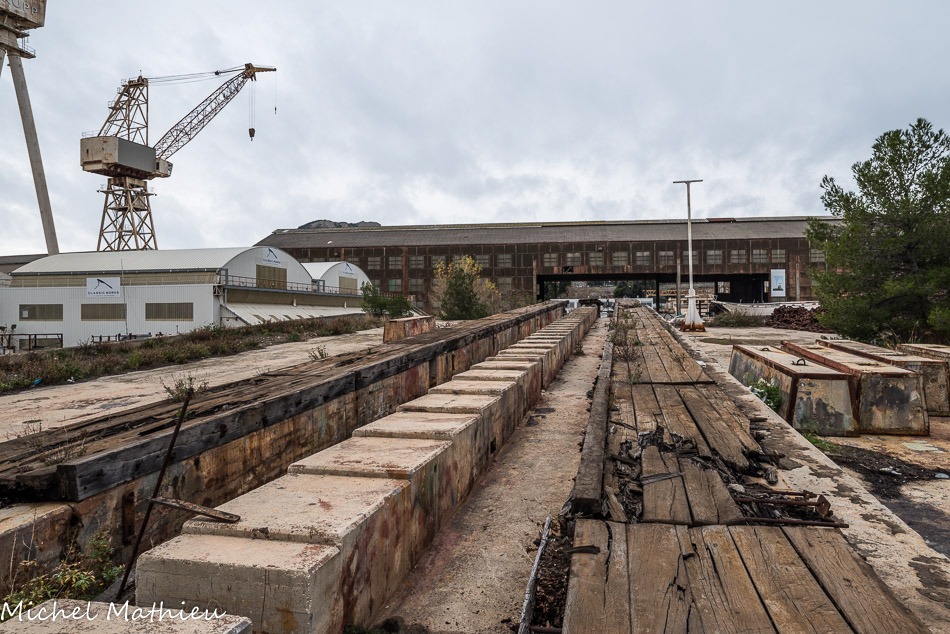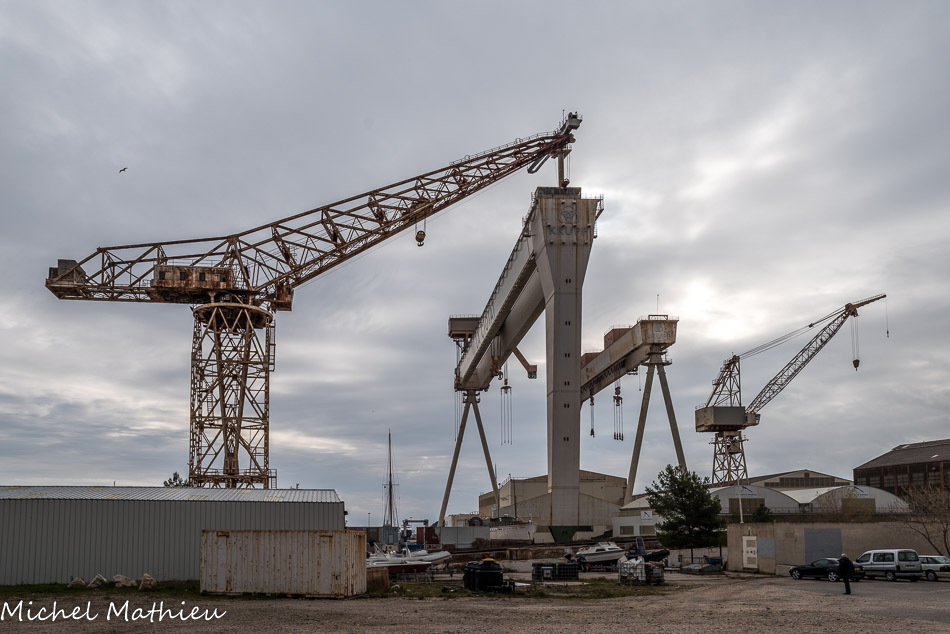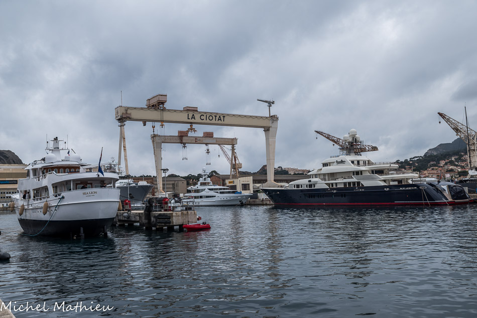 Aujourd’hui, le chantier naval de La Ciotat accueille 41 entreprises privées, pour 600 employés et plus du double de sous-traitants. Le site est passé de 90 bateaux en 2004 à 500 escales en 2014, dont 300 mises à sec. Il génère un chiffre d’affaires de 70 millions d’euros et se positionne comme le premier chantier naval d’Europe et un acteur mondial de premier plan. Emplacement de la cale n°2. Reconstruite en 1952, elle faisait 172m de long sur 31m de large, elle permettait la construction d’unités de 32.000 tonnes et comprenait 3 grues de 3 à 7 tonnes, une grue de 90 tonnes et celle de 120 tonnes de la cale n°1 (sur la photo). A gauche, la grue qui s'est pliée et qu'il a donc fallu renforcer.