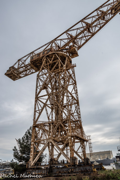 La grue de 120 tonnes de la cale n°1. En bas, le bateau-porte.
