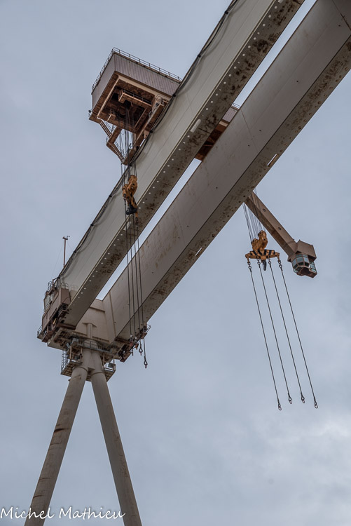 De gauche à droite : la grue de 250 tonnes de la Grande Forme, le second portique de 660 tonnes et d'une portée de 143 m, le premier portique de 500 tonnes (2 x 250 tonnes) d’une portée de 77,50m.