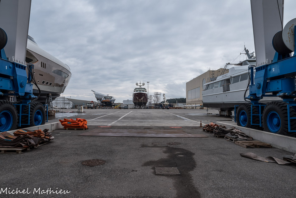 Au pied de l'élévateur à sangle pour les bateaux de 300 t /45 mètres de long. La plateforme de stationnement des bateaux.