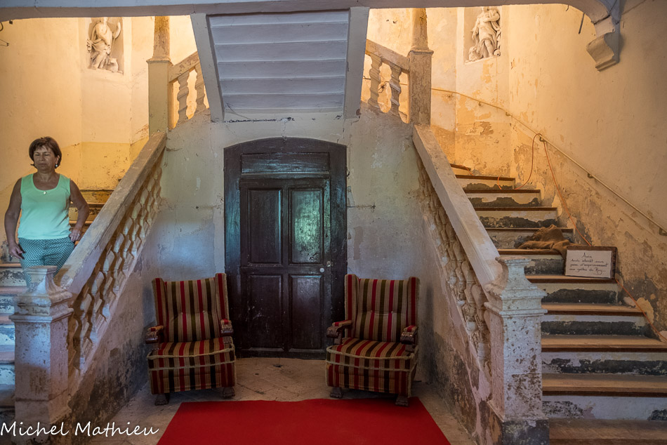 L’escalier monumental à sections carrées, à cage ouverte et à double révolution rampe sur rampe. Un décor de balustrades de section carrée, de colonnes à chapiteaux, de niches avec statues, en fait le principal ornement de la demeure.