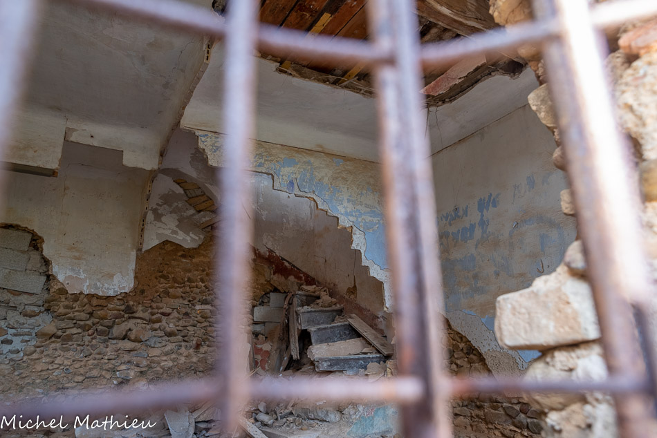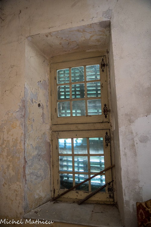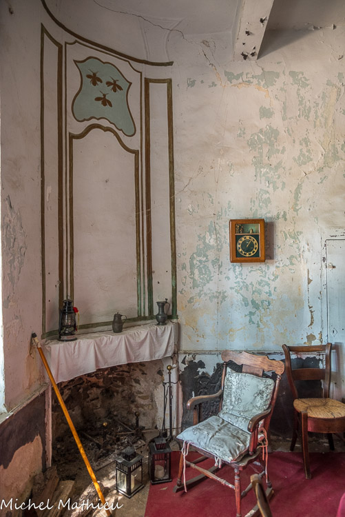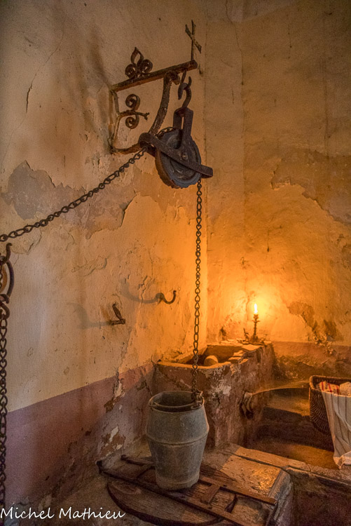 La ferronnerie en forme de croix et de fleurs de lys sur la poulie du puits intérieur.