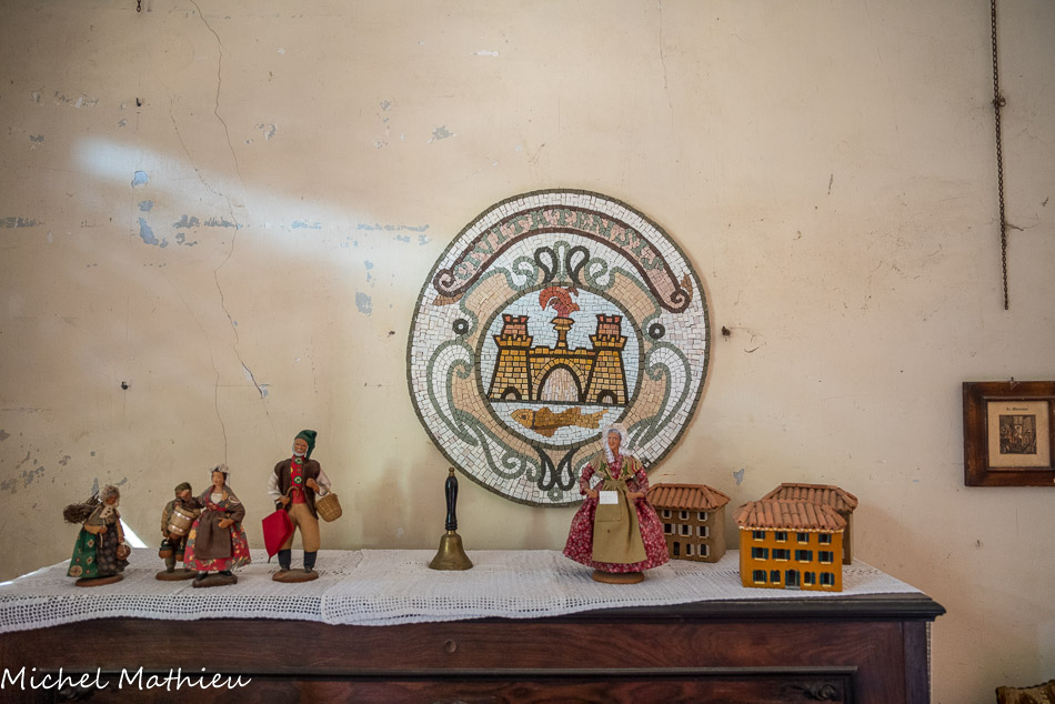 Mosaïque avec les armes de La Ciotat : un château, ouvert de trois portes, avec une crosse abbatiale qui évoque l’allégeance à l’abbaye de Saint Victor et un poisson qui symbolise les activités maritimes du port. Sur le meuble, des maquettes de la bastide.