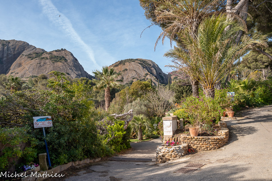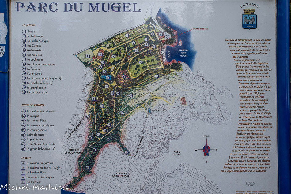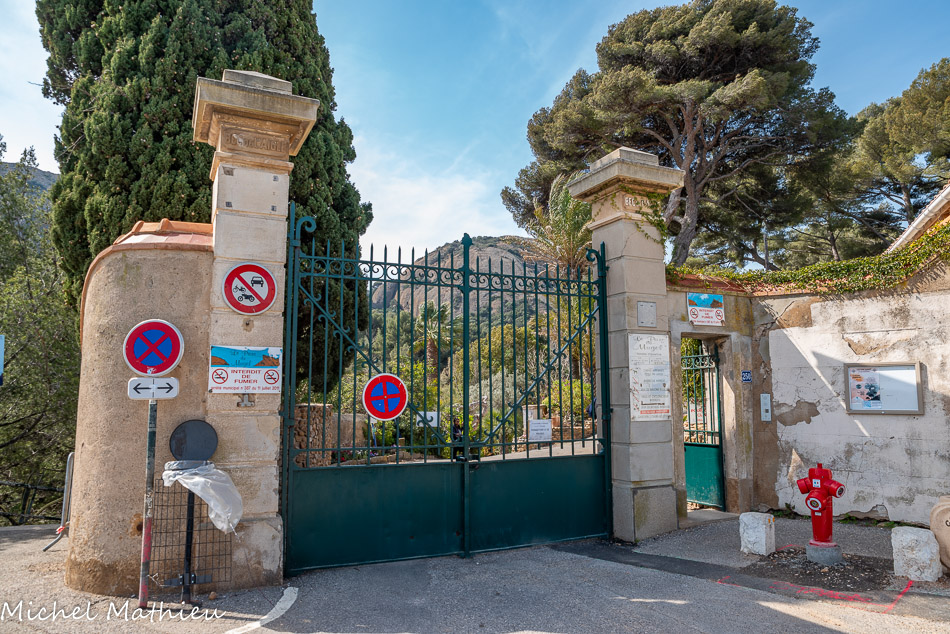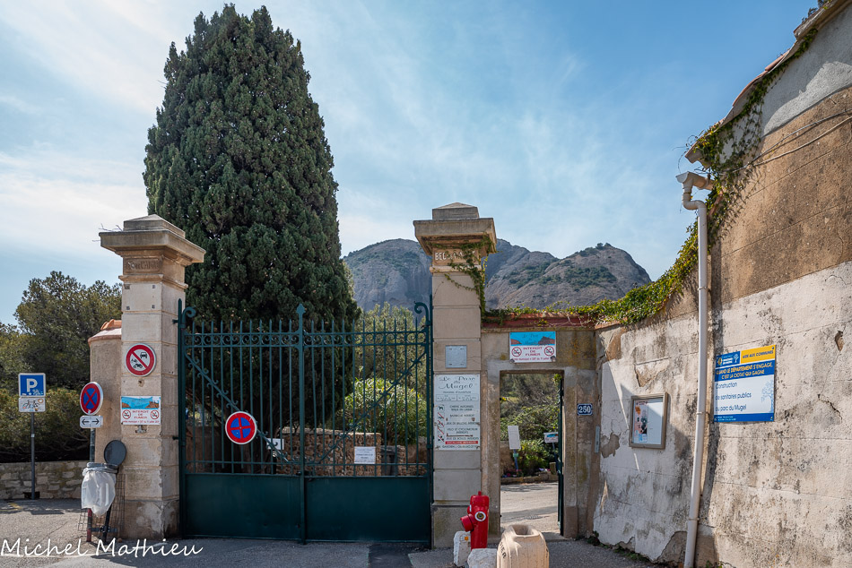 Entrée du parc. Autrefois propriété privée, le parc du Mugel est depuis 1987 aménagé et entretenu avec soin par la municipalité de la Ciotat, ce qui lui a valut d’être classé « Jardin remarquable ».