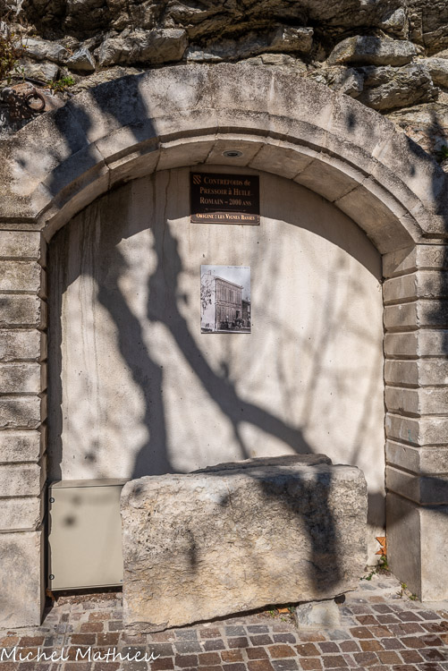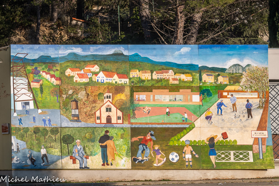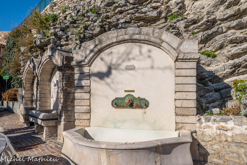 En 1865, on réussit à capter une source au-dessus de Mimet, vers le Collet de Lafont. L’eau arrivait cette fois « par gravité ». On construisit alors cette fontaine : conque en pierre froide, lion en fonte, robinet, les fers pour mettre la cruche, deux pilastres supportant un fronton, le tout appuyé à des plis de roches calcaires.