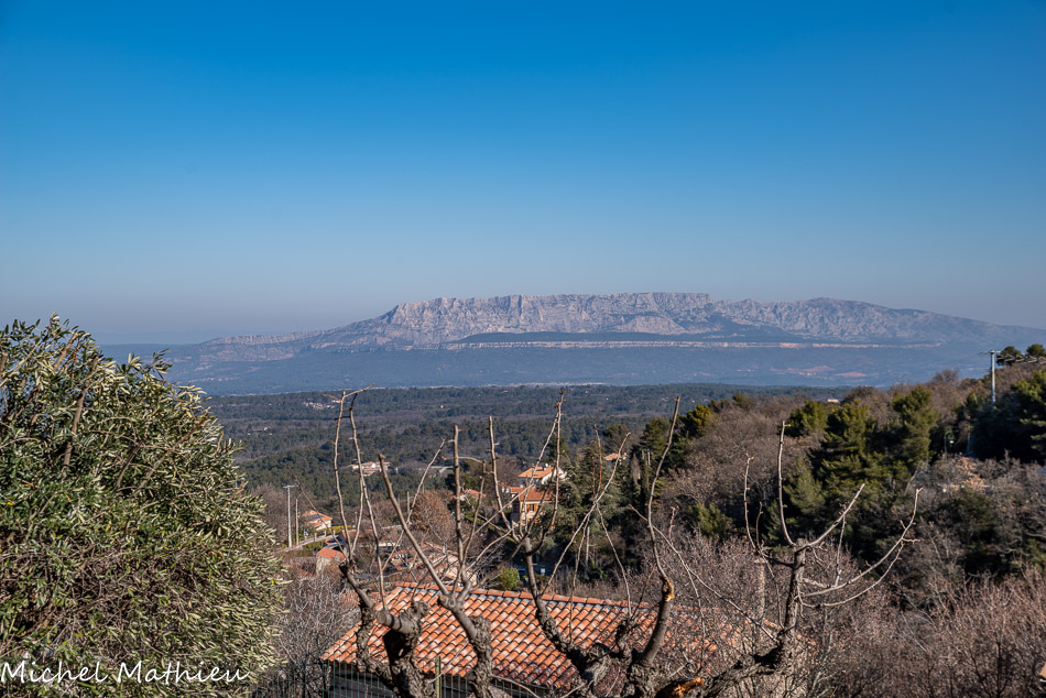 Au premier plan, la Ferme de la Tour, les tours et la cheminée de la centrale thermique. Au fond, Aix-en-Provence, puis le Luberon.