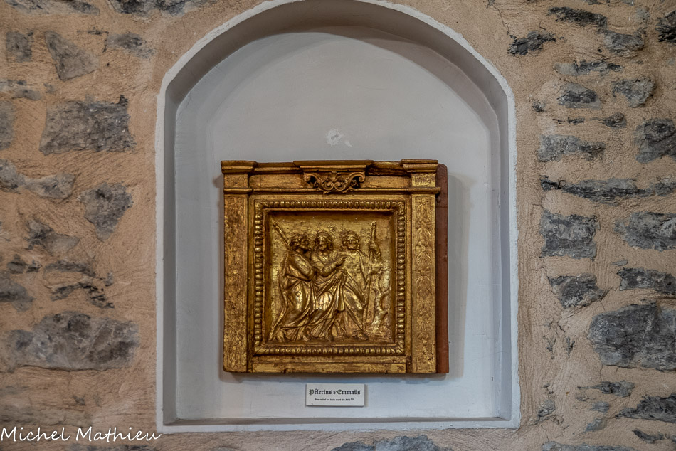 Pèlerins d’Emmaüs. Bas-relief en bois doré du XVIIème. Il devait faire partie d'un retable de N.-D. des Anges, démantelé, à présent attribué à Jean Doux.