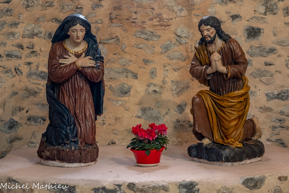 La Nativité. Les deux santons (Maria et Joseph en bois peint) proviennent de la 1ère crèche d’église de Provence, de 1644, par Etienne Laloissier. Ils faisaient partie d'une crèche d'église de six santons : Marie, Jésus, Joseph, l'Ange, la tête du boeuf et celle de l'âne sortant du rocher.