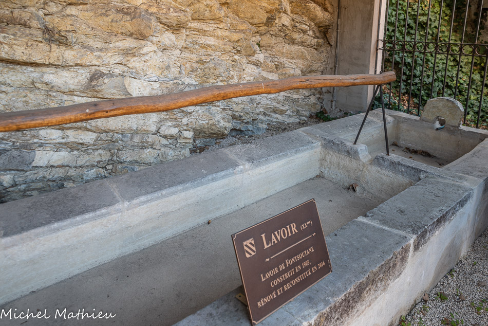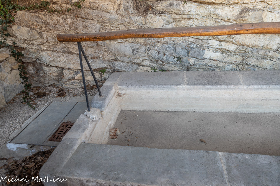 On distingue deux bacs de lavoir avec planche à frotter des deux côtés, arrivée de l'eau à droite et évacuation à gauche. Ces planches sont en pierre froide, lisse et au-dessus se trouve la poutre en bois pour l'égouttage du linge. Ce lavoir, démonté soigneusement, a été remonté en l'état à l'entrée du village, en 2016, à l'abri d'une "grotte".