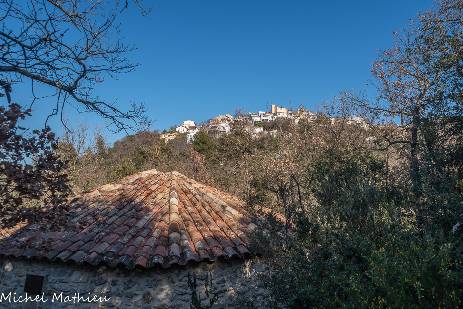La toiture de la "cape de four" dominée par les maisons, dont la tour du château, de Mimet.