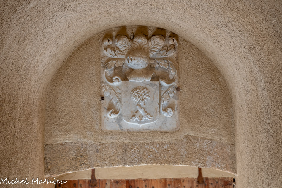 1638 : les Valbelle prennent possession du château. Les armes sont celles de Marguerite-Delphine de Valbelle, dame de Tourves, qui épousa André Geoffroy de Valbelle, un cousin éloigné. Au centre, le lévrier des de Valbelle, entourés des lions couronnés, car ils étaient vicomtes de Marseille et de la croix des ducs de Toulouse. Au-dessus, la couronne de duc.